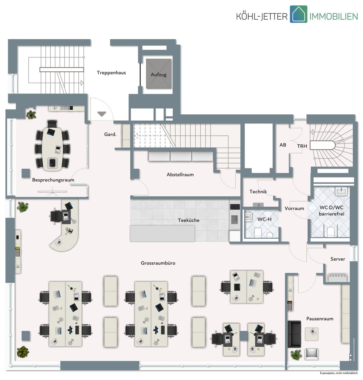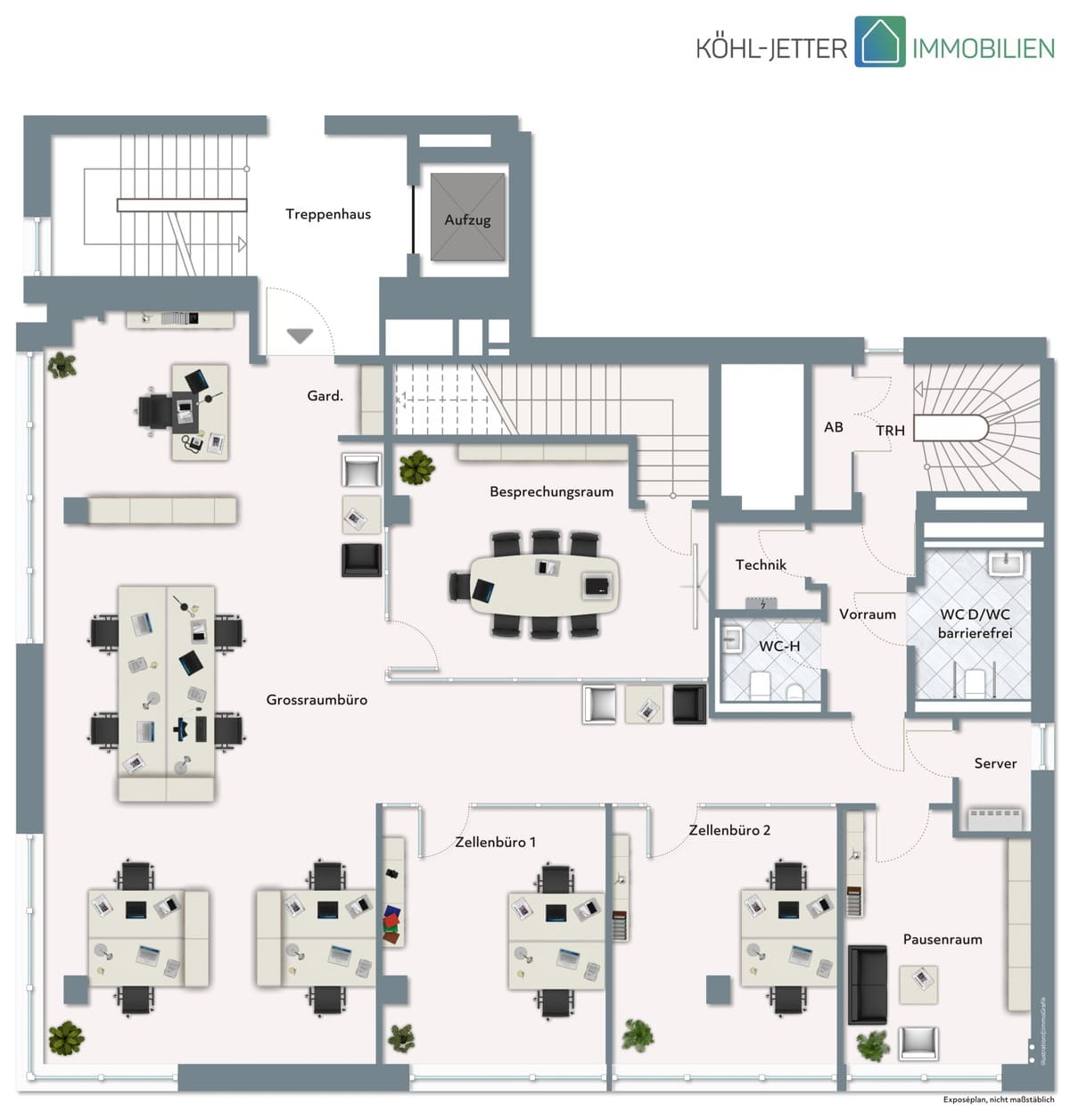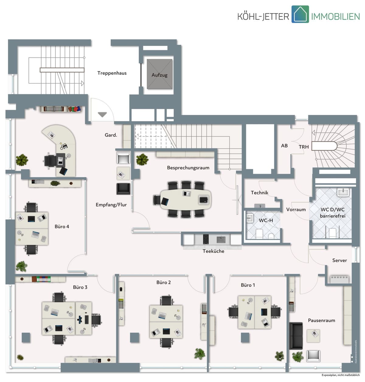 Verschiedene Grundrissvarianten stehen zur Verfügung, wodurch die Räume optimal auf die Bedürfnisse von Büros, Kanzleien oder Praxen abgestimmt werden können.