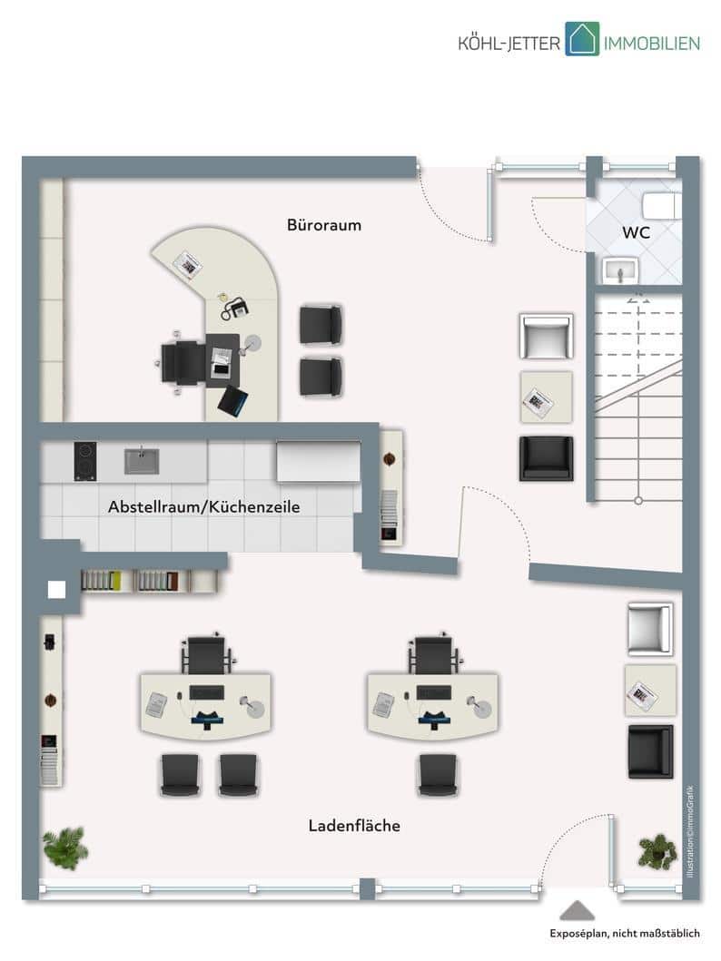 Diese attraktive Gewerbeeinheit bietet eine durchdachte Raumaufteilung und vielseitige Nutzungsmöglichkeiten – ideal für Büro, Praxis oder Dienstleistungsgewerbe.