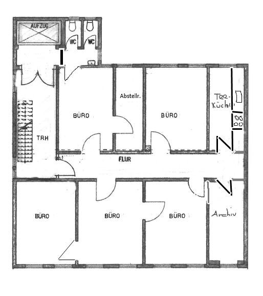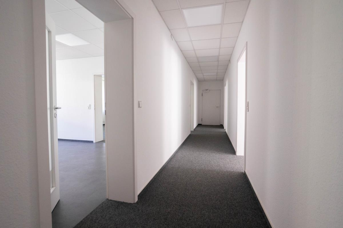 Über einen Flurbereich gelangen Sie in die verschiedenen Räume. Die Fläche besteht aus insgesamt fünf Büros, welche sich ideal aufteilen lassen. Eine Teeküche mit einer Einbauküche steht Ihnen ebenfalls zur Verfügung und iist im Mietpreis inklusive. Weiter haben Sie die Möglichkeit die beiden Abstellräume als Kopier-/Lager – oder Serverraum zu nutzen.