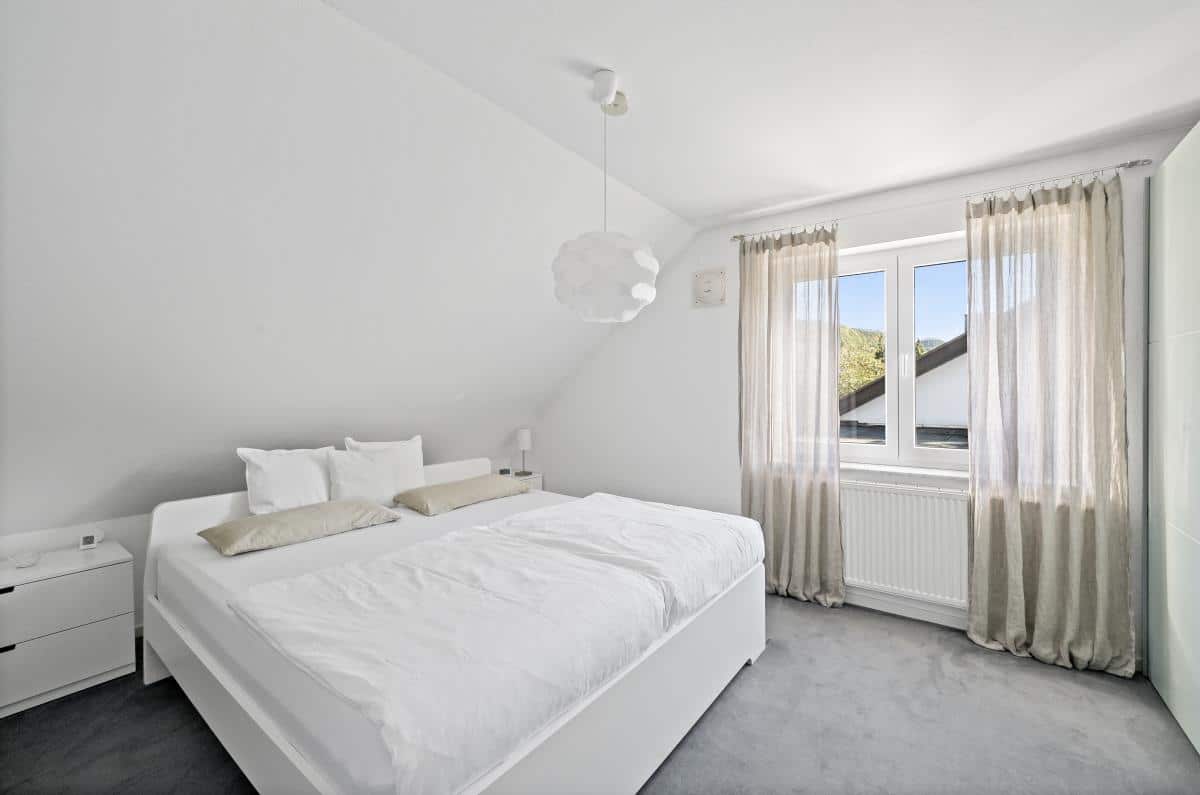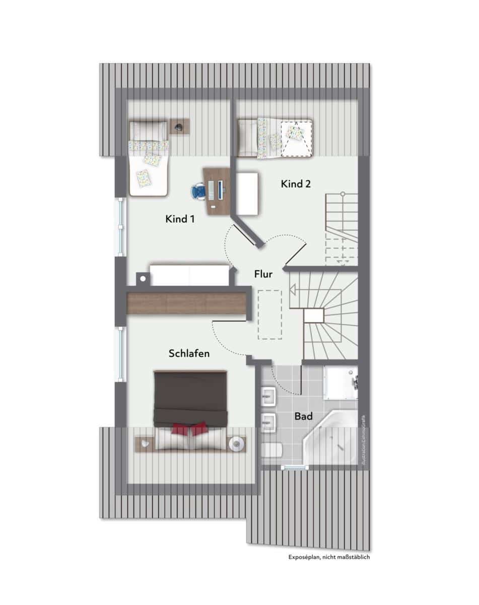 Im Dachgeschoss befinden sich drei Schlaf- bzw. Kinderzimmer sowie ein gepflegtes Tageslichtbad mit Dusche, Badewanne und WC – ideal für die Bedürfnisse einer Familie.