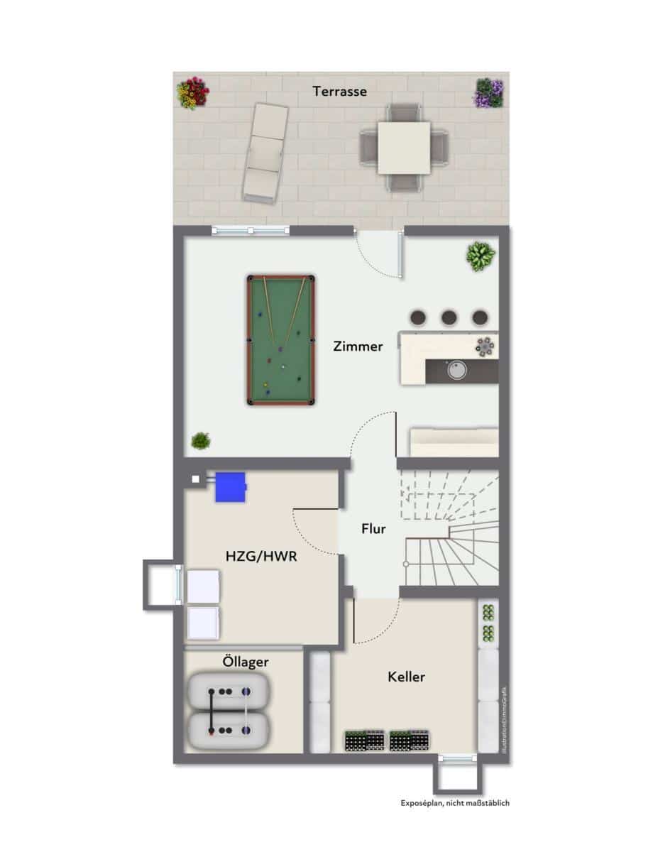Das Untergeschoss bietet neben einem Keller- und Technikraum ein weiteres Highlight: ein ca. 25 m² großes Zimmer mit Zugang zu einer zusätzlichen Terrasse. Dieses kann flexibel als Gästezimmer, Büro oder zusätzlicher Schlafraum genutzt werden.