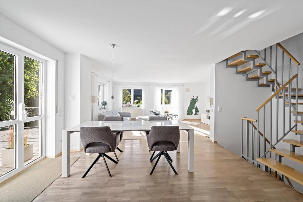 Schon beim Betreten überzeugt der helle, geräumige Dielenbereich, von dem aus Sie in alle Räume des Erdgeschosses gelangen. Hier erwarten Sie ein Gäste-WC, der großzügige, lichtdurchflutete Wohn- und Essbereich mit angrenzender, offener Küche sowie der direkte Zugang zur großen, sonnigen Süd-/Westterrasse. Die gepflegte Einbauküche fügt sich harmonisch in den Wohnbereich ein. Der liebevoll angelegte Gartenbereich präsentiert sich als wahres Paradies für Gartenliebhaber und bietet vielfältige Gestaltungsmöglichkeiten.