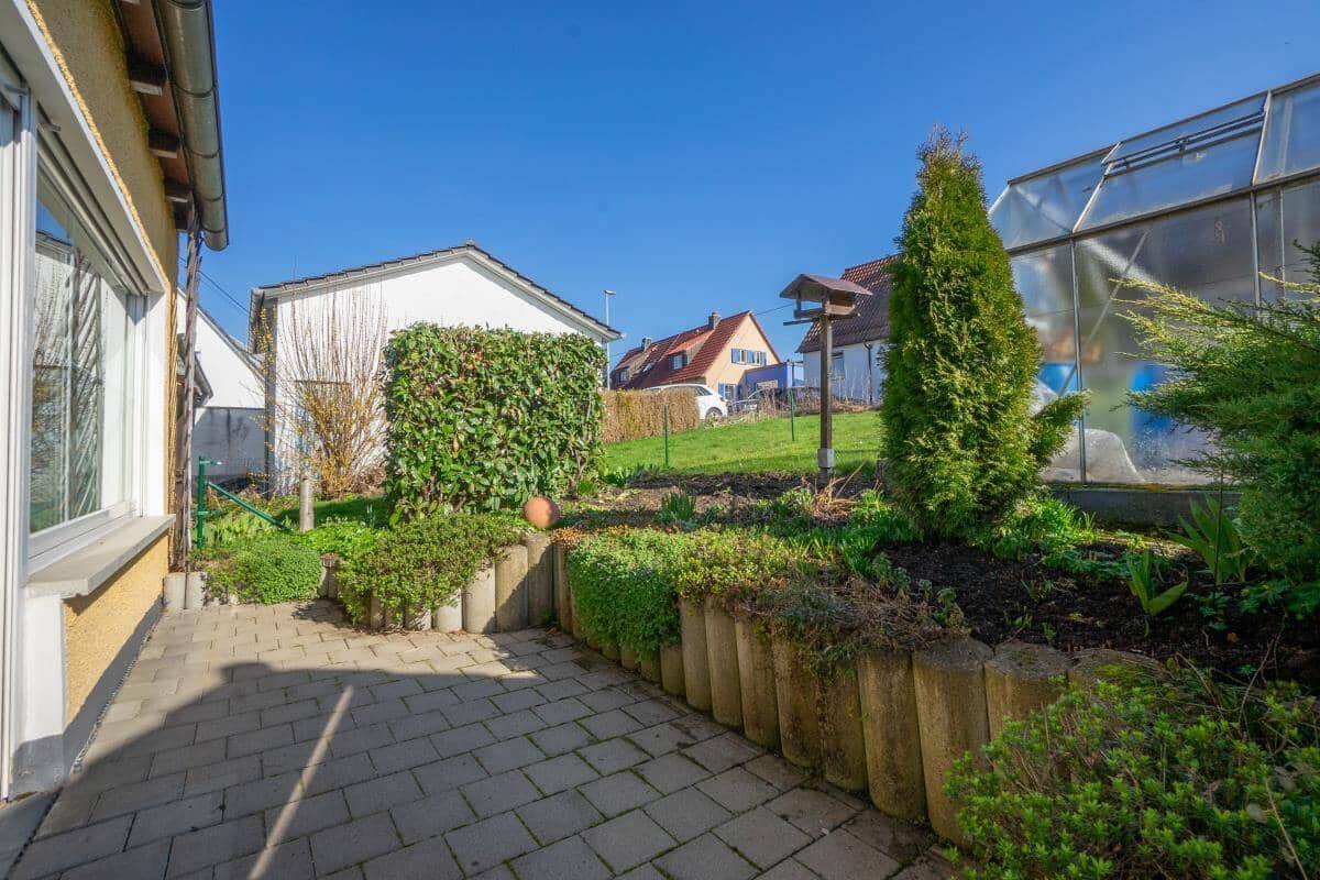 Der sonnige Gartenbereich mit angrenzender, großer Terrasse (teilweise überdacht) lässt keine Wünsche offen. Ein wahres Paradies für Kinder oder für einen gemeinsamen Grillabend mit Freunden oder der Familie! Zusätzlich steht Ihnen noch ein Gartenhaus/Schuppen für Rasenmäher o.ä. zur Verfügung. Eine Zisterne für die Bewässerung ist vorhanden.