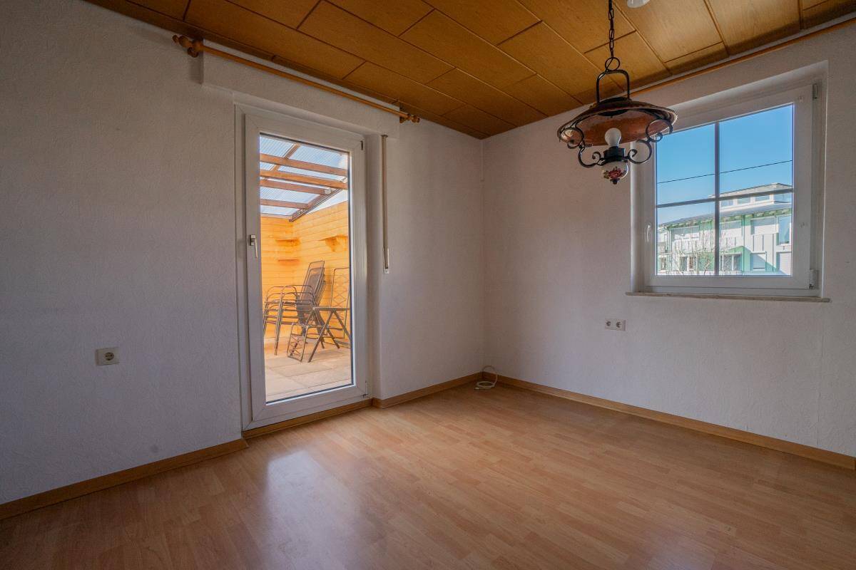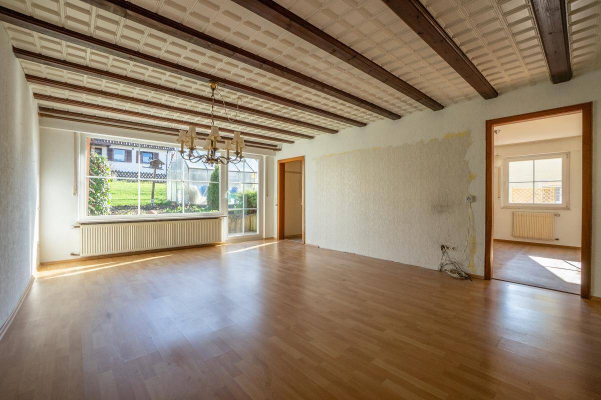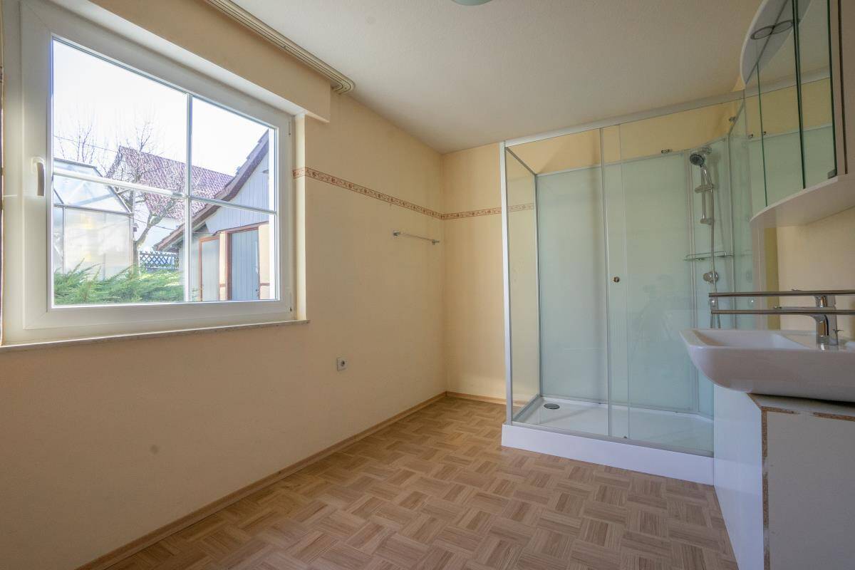 Über wenige Außentreppen gelangen Sie in das Erdgeschoss des Hauses. Auf dieser Wohnebene befindet sich das großzügige Wohnzimmer, der separate Küchenbereich inkl. Einbauküche mit angrenzendem Esszimmer, ein WC sowie ein Zimmer zur flexiblen Nutzung. Ein weiteres Zimmer wurde im April 2022 zu einem Badezimmer mit Dusche umfunktioniert. Die Vorbereitung für ein WC ist ebenfalls vorhanden. Über den Wohnbereich sowie über das Esszimmer gelangen Sie auf die Terrasse sowie in den Garten.