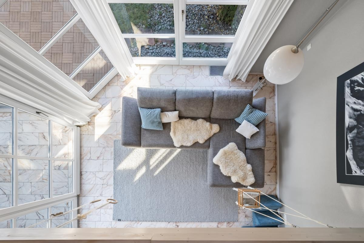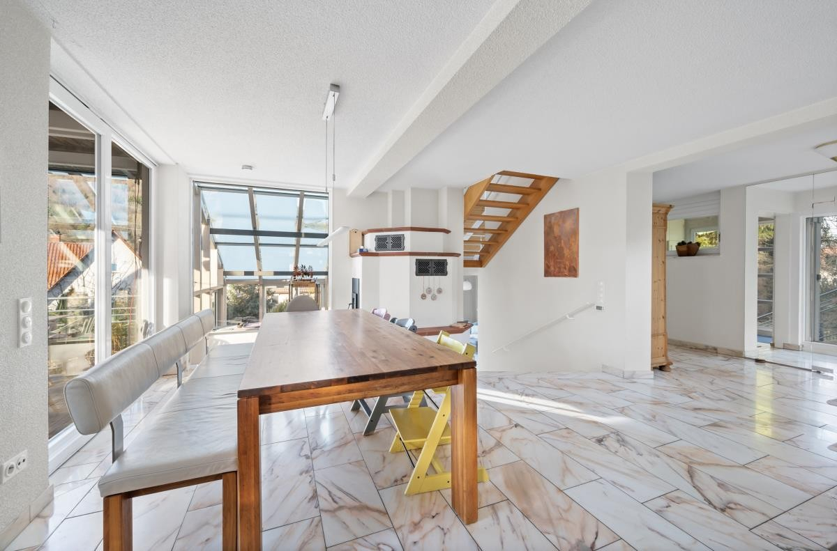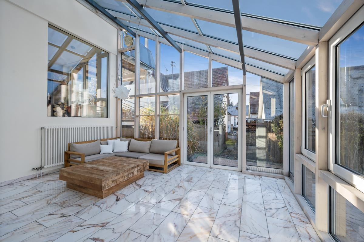 Wenige Stufen führen hinunter in das großzügige Wohnzimmer sowie in den angrenzenden Wintergarten. Von hier aus gelangt man direkt auf die sonnige Südwest-Terrasse.