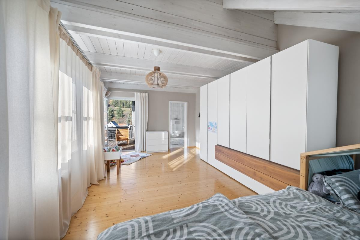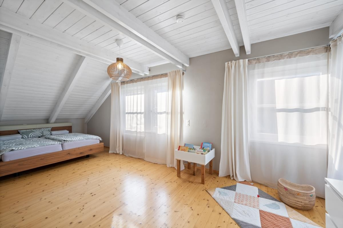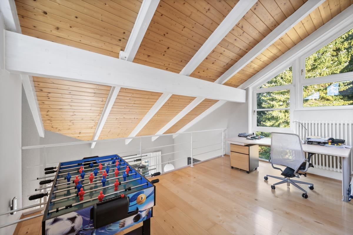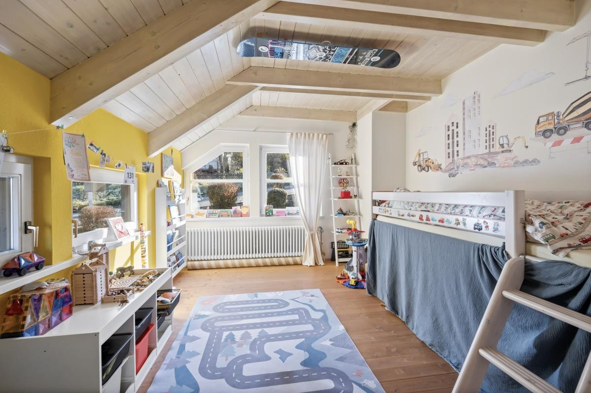 Im Dachgeschoss stehen ein weiteres Kinderzimmer sowie ein großzügiges Studiozimmer zur Verfügung, das sich flexibel als Atelier, Arbeitsbereich oder zusätzliches Kinderzimmer nutzen lässt.