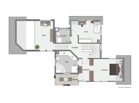 Das 1. OG überzeugt durch eine durchdachte Raumaufteilung: Neben einem offenen Büro- bzw. Galeriezimmer mit Blick ins Wohnzimmer befinden sich hier das Hauptschlafzimmer mit direktem Zugang zum komfortablen Hauptbadezimmer sowie ein weiteres Kinderzimmer mit separatem Badezimmer. Das große Badezimmer ist mit Eckdusche, Badewanne, Doppelwaschbecken und WC ausgestattet; das zweite Bad verfügt über Dusche, WC und Waschbecken. Vom Schlafzimmer aus führt ein kleiner Balkon ins Freie.