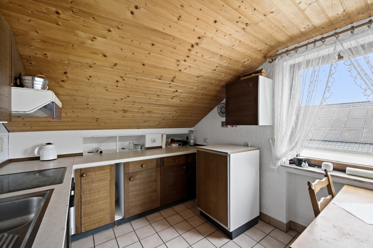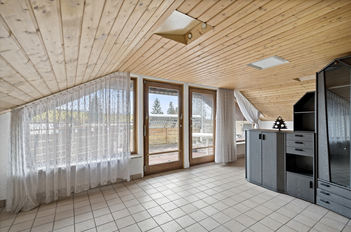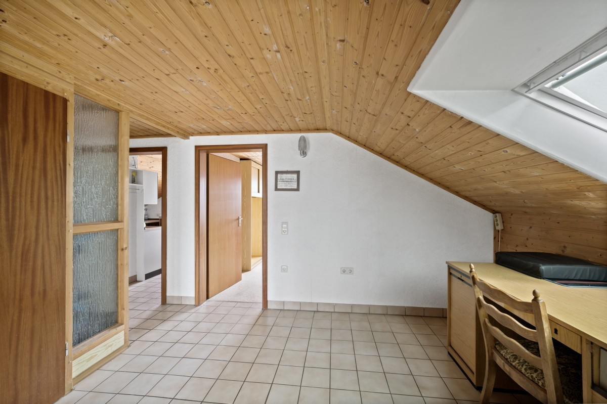 Im Dachgeschoss eröffnet sich eine weitere, vollwertig nutzbare Ebene mit besonderem Potenzial. Neben einer Küche, einem kleinen Badezimmer und einem Schlafzimmer stehen ein geräumiger Dielenbereich sowie ein großes Wohn- und Esszimmer mit direktem Zugang zur Dachterrasse zur Verfügung. Von hier genießen Sie eine schöne Aussicht über die Umgebung. Theoretisch besteht die Möglichkeit, im Dachgeschoss eine zweite Wohneinheit zu realisieren – ideal für Mehrgenerationenwohnen, Arbeiten von zu Hause oder zur teilweisen Vermietung.