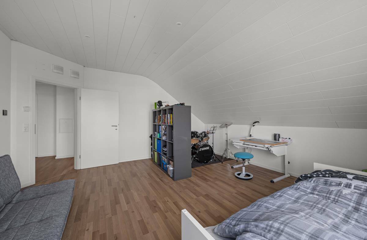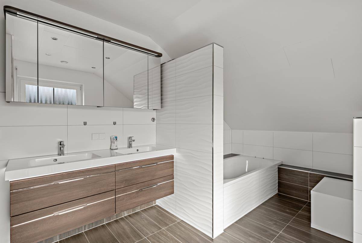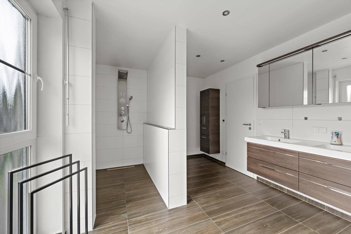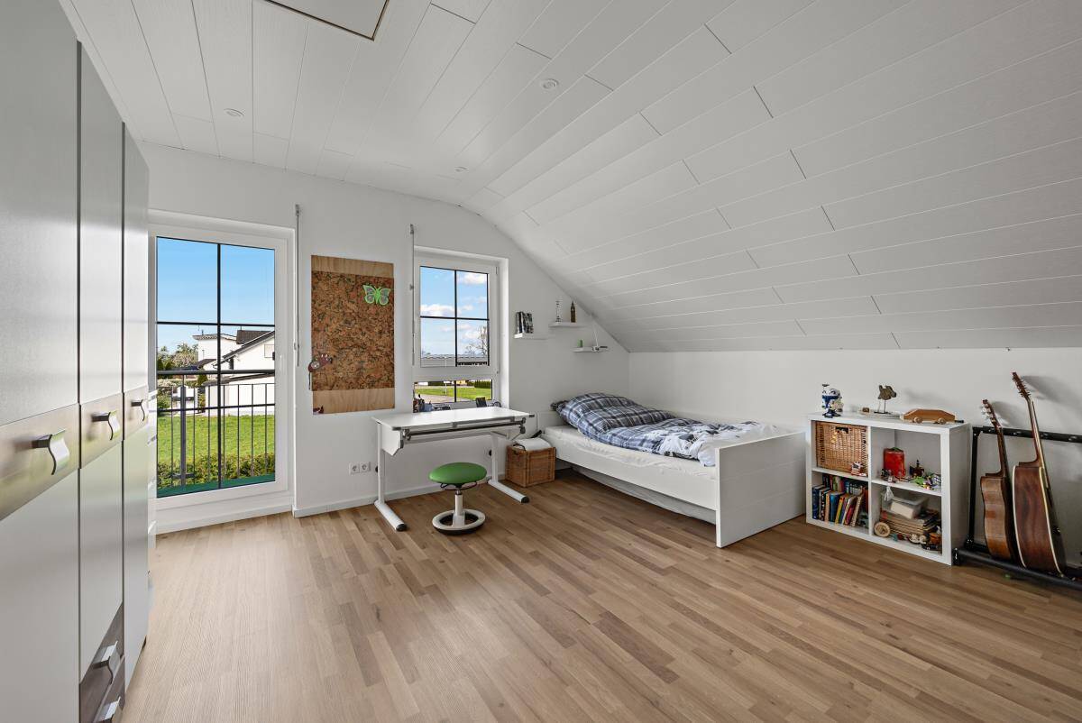 Im Obergeschoss des Hauses befindet sich drei geräumige Schlaf-/Kinderzimmer. Ein Balkon ist auf dieser Wohnebene ebenfalls vorhanden. Das moderne Tageslichtbad mit großer, begehbarer Dusche, Badewanne, WC und Doppelwaschbecken lässt keine Wünsche offen.