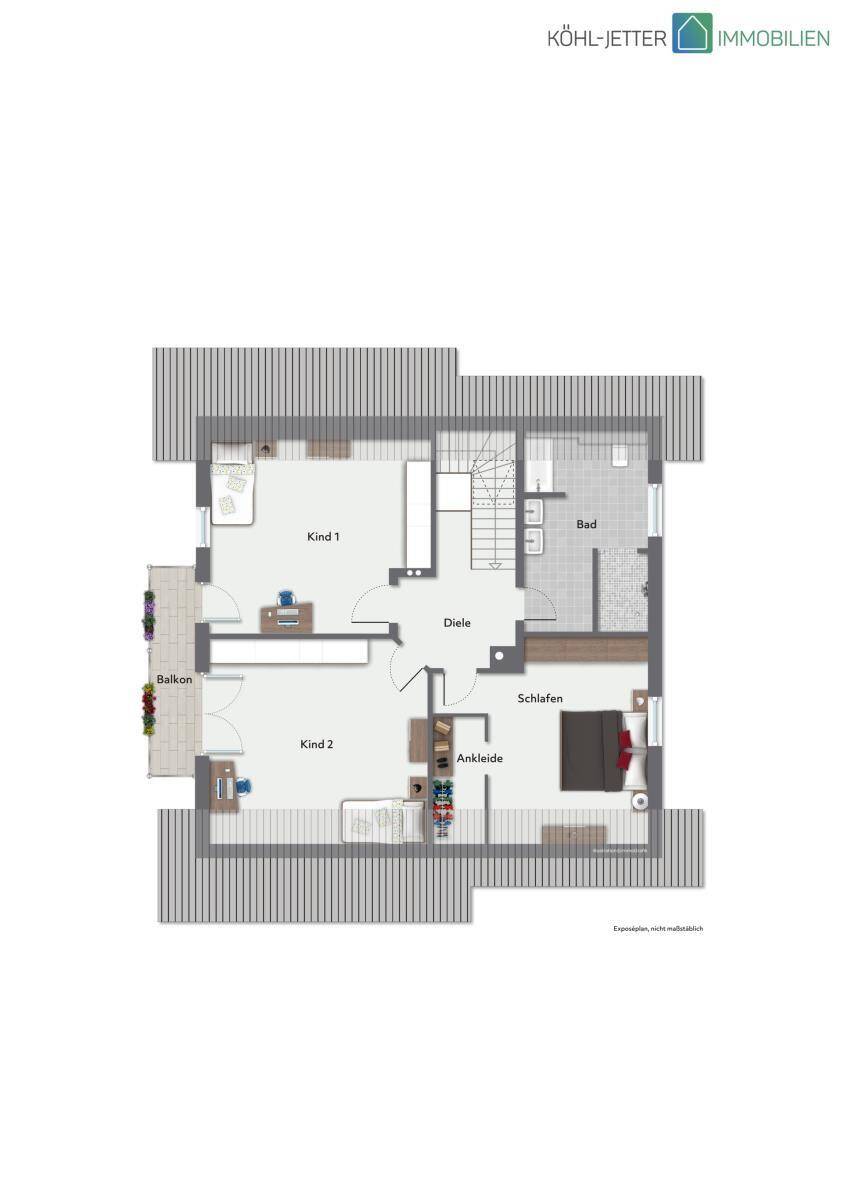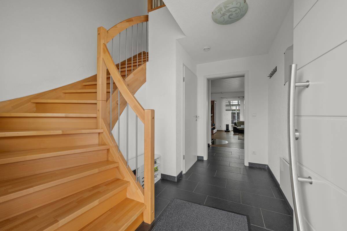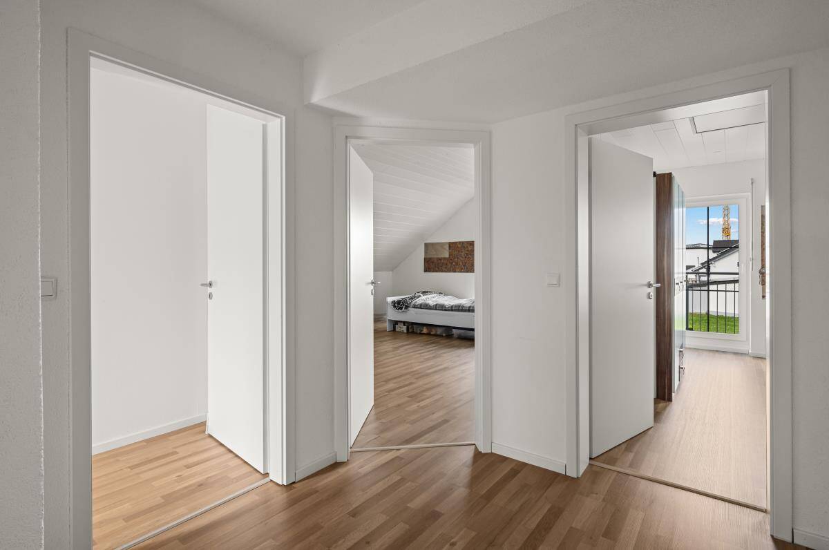 Im Obergeschoss des Hauses befindet sich drei geräumige Schlaf-/Kinderzimmer. Ein Balkon ist auf dieser Wohnebene ebenfalls vorhanden. Das moderne Tageslichtbad mit großer, begehbarer Dusche, Badewanne, WC und Doppelwaschbecken lässt keine Wünsche offen.