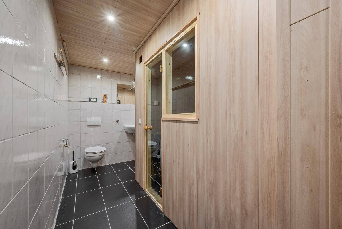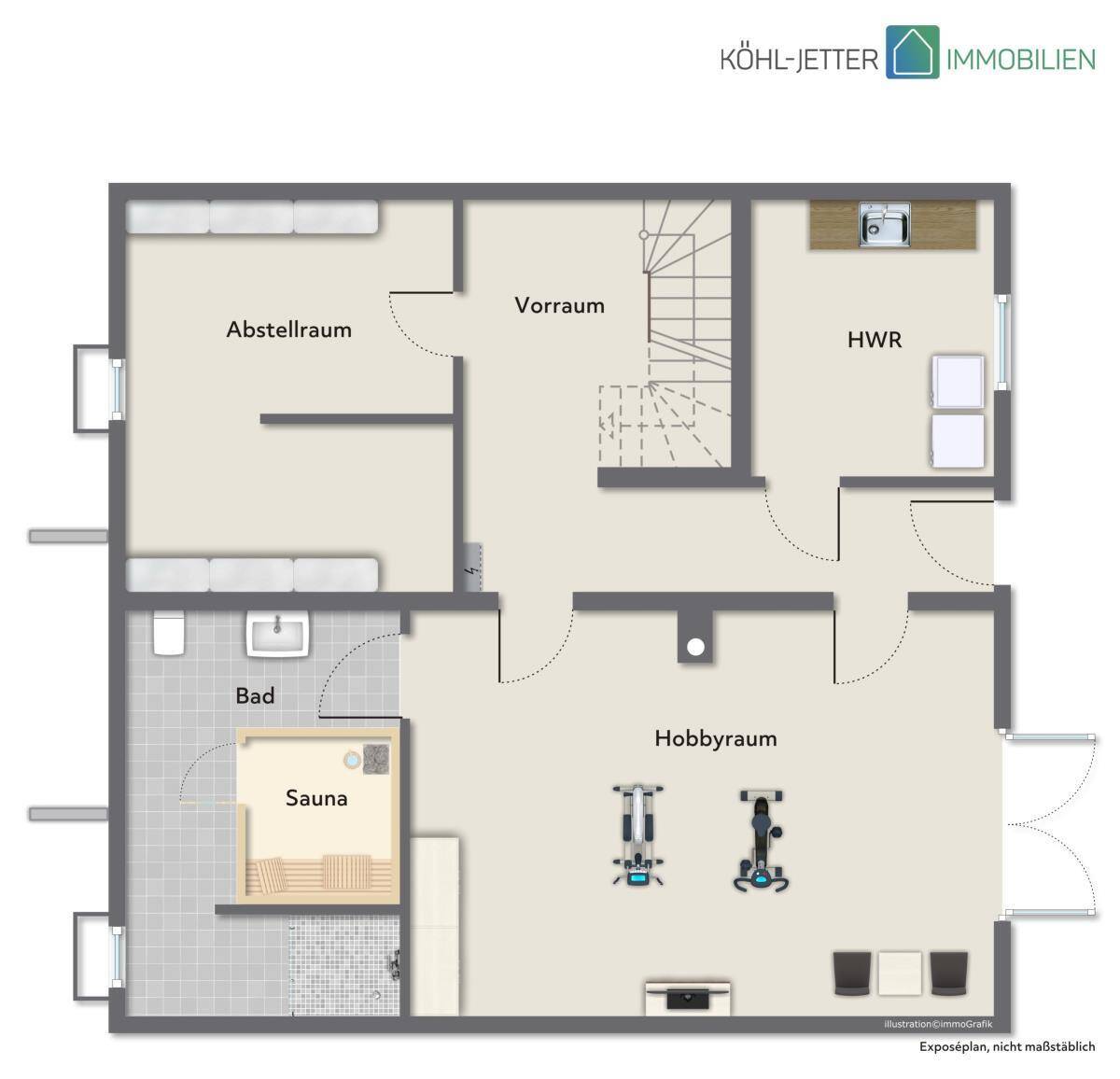 Im Untergeschoss befindet sich ein Abstellraum, der Technikraum inkl. Waschküche sowie ein großer Hobbyraum zur flexiblen Nutzung. Neben dem Hobbyraum befindet sich ein kleiner Wellnessbereich mit Sauna, Dusche und WC.