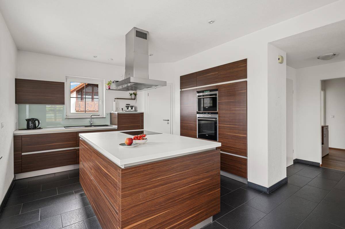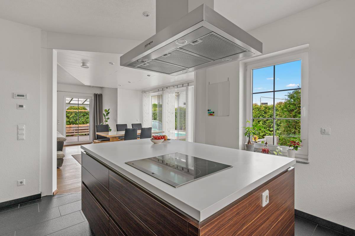 Die hohe Qualität sowie der durchdachte Grundriss werden Sie begeistern. Schon der offene und einladende Dielenbereich verspricht ein einzigartiges Wohnerlebnis. Der Flurbereich leitet Sie in den lichtdurchfluteten Wohn-/Essbereich mit angrenzendem, offenem Küchenbereich. Der Küchenbereich mit Kochinsel ist mit einer modernen Einbauküche ausgestattet, welche bereits im Kaufpreis enthalten ist. Direkt neben der Küche befindet sich eine Speisekammer. Ein Holzofen sorgt für ein angenehmes Raumklima in der kalten Jahreszeit.
