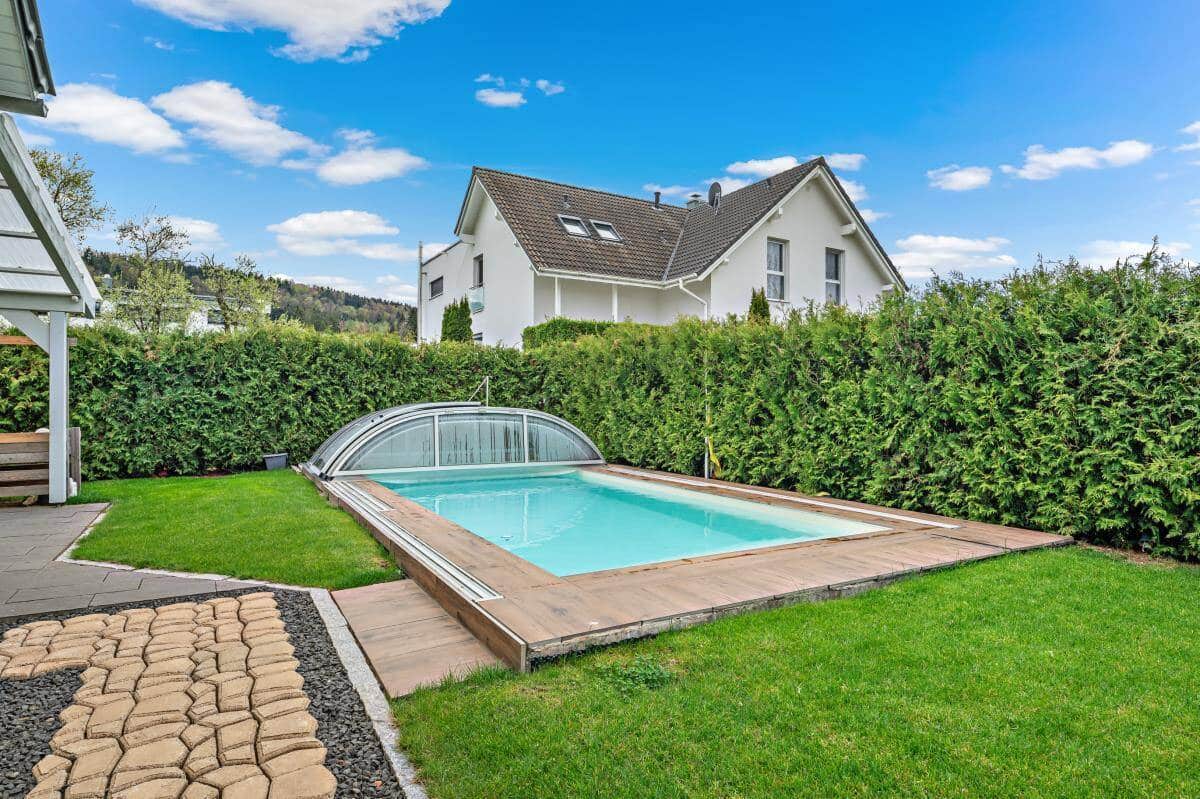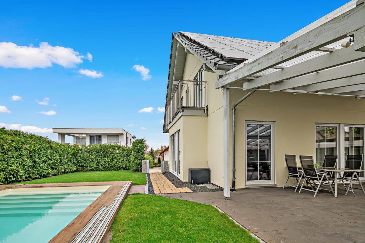 Der sonnige Gartenbereich in Süd-/Westausrichtung bildet ein zauberhaftes Outdoor-Refugium; die privilegierte Lage in einem ruhigen, familienfreundlichen Wohngebiet macht dieses attraktive Familiendomizil zu einer Rarität. Die große, sonnenverwöhnte Terrasse lässt keine Wünsche offen und bietet genügend Platz für einen entspannten Grillabend mit Freunden oder der Familie! Ein besonderes Highlight ist der großzügige Außenpool, der im Jahr 2022 errichtet wurde. Ausgestattet mit einem praktischen Schiebedach, lässt sich der Pool flexibel nutzen – ob offen unter freiem Himmel oder geschützt bei wechselhaftem Wetter. An heißen Sommertagen bietet er die perfekte Möglichkeit zur Abkühlung und verspricht erholsame Stunden im eigenen Gartenparadies.