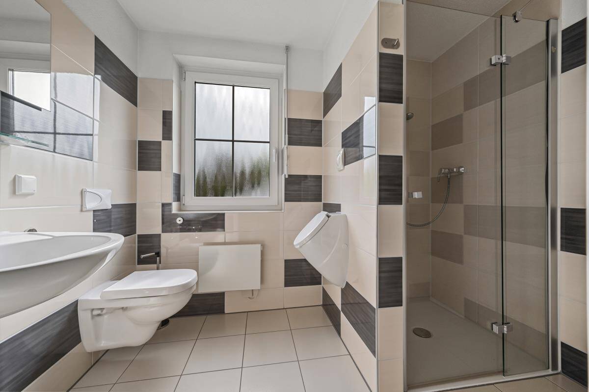 Bodentiefe Fenster und eine Deckenhöhe von 2,60 m sorgen für viel Transparenz und Helligkeit. Für zusätzlichen Komfort auf dieser Wohnebene sorgen zwei Zimmer zur flexiblen Nutzung sowie ein modernes Gäste-Bad mit Dusche, WC und Pissoir.