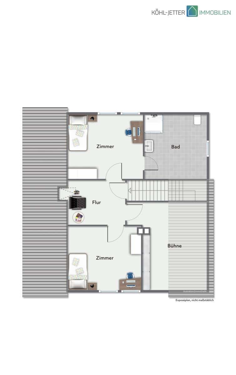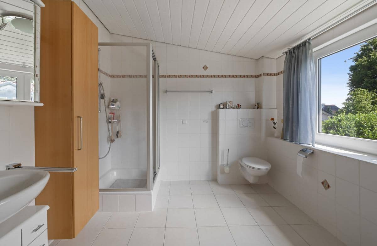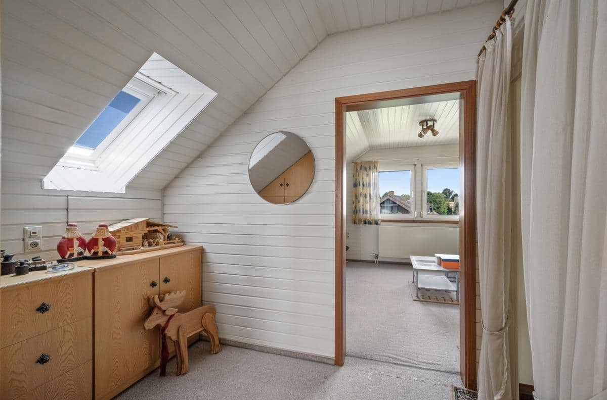 Das Dachgeschoss beherbergt zwei weitere Schlafzimmer sowie ein großes Tageslichtbad mit Dusche und WC – ideal für größere Familien oder zur flexiblen Nutzung. Zusätzlich steht Ihnen ein nicht ausgebauter Bühnenbereich als Abstellfläche zur Verfügung.