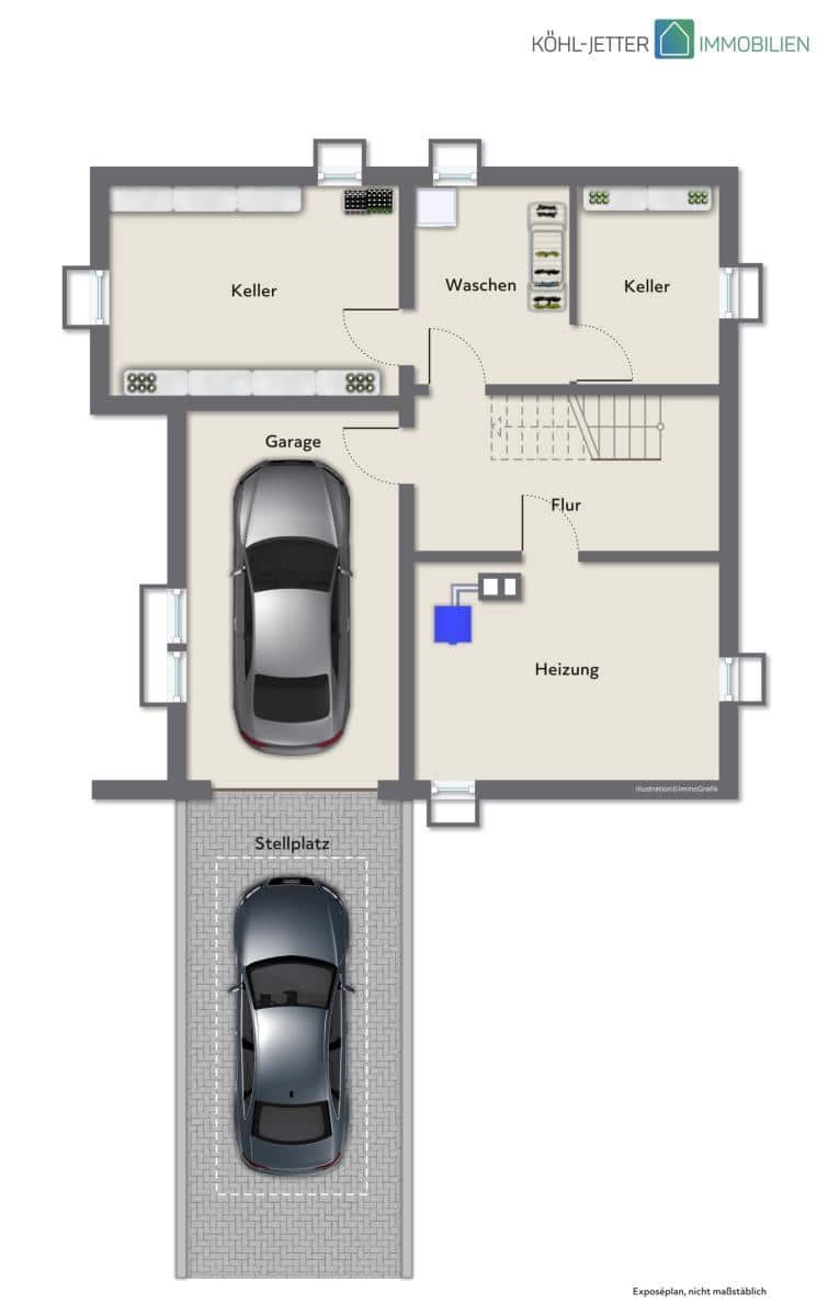 Zusätzlichen Stauraum und praktische Nutzflächen finden Sie im voll unterkellerten Untergeschoss. Besonders komfortabel: Die im Haus integrierte Garage mit direktem Zugang – so gelangen Sie auch bei schlechtem Wetter trockenen Fußes ins Haus.