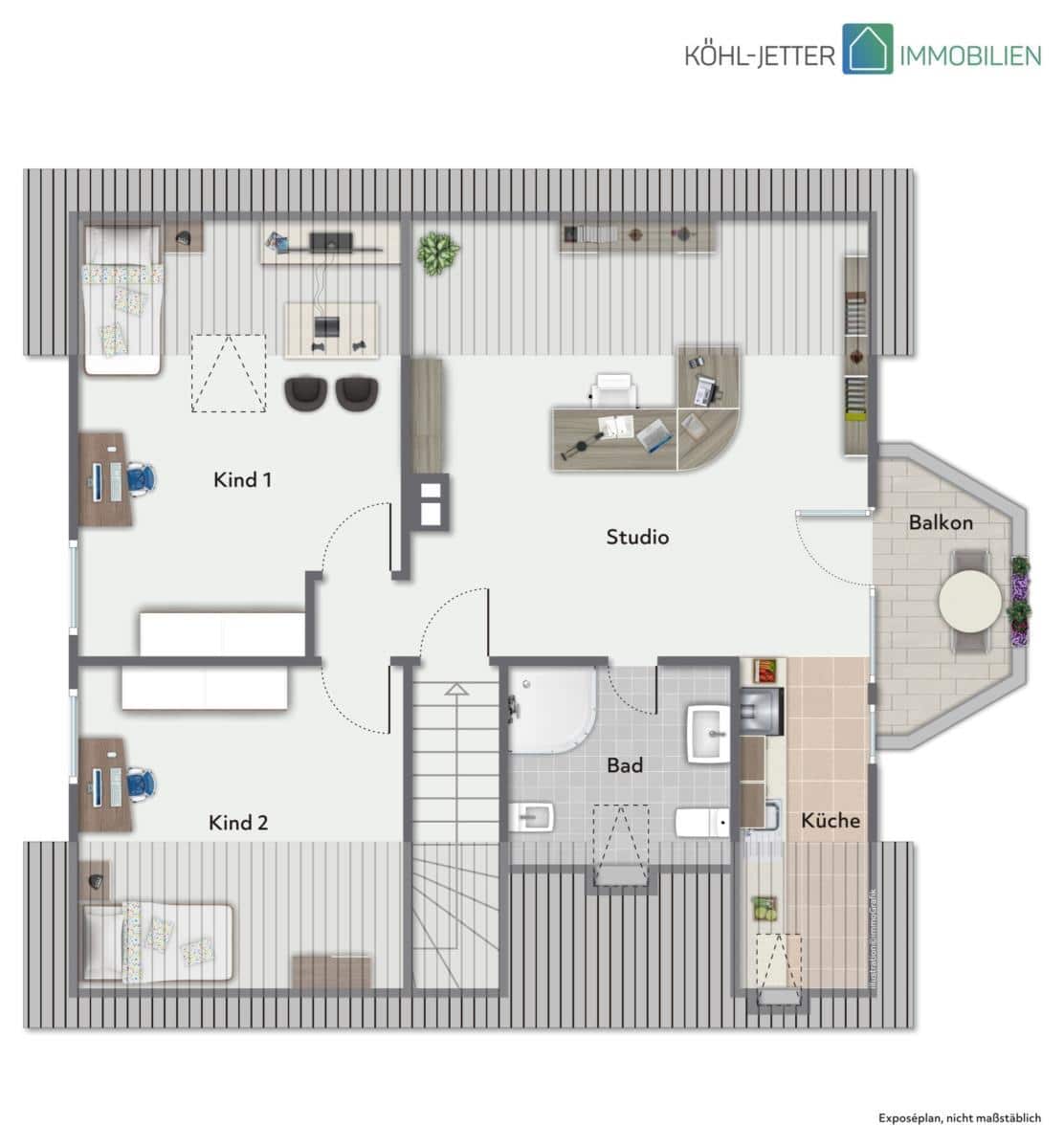 Im Dachgeschoss des Hauses befindet sich ein großer, lichtdurchfluteter Studiobereich mit Küchenzeile, ein renoviertes Tageslichtbad mit Dusche und WC sowie zwei Schlafzimmer. Ein Balkon kann über das Studio erreicht werden. Der Küchenbereich ist mit einer neuen Einbauküche ausgestattet, welche bereits im Mietpreis enthalten ist.