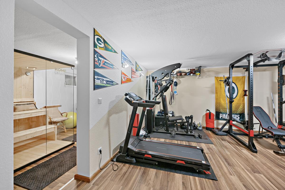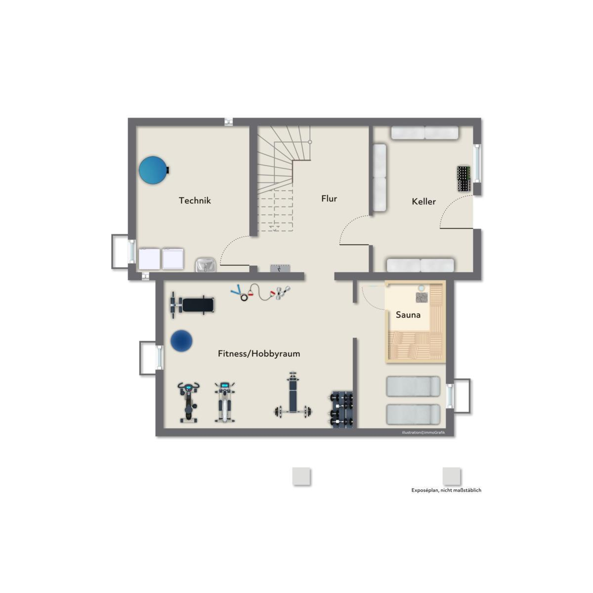 Im Untergeschoss befindet sich ein Abstellraum, der Technikraum inkl. Waschküche sowie ein großer Hobbyraum zur flexiblen Nutzung. Angrenzend an den Hobbyraum befindet sich ein kleiner Wellnessbereich mit Sauna.