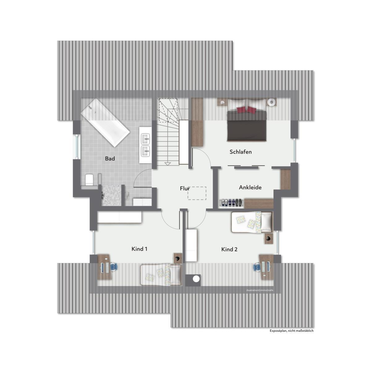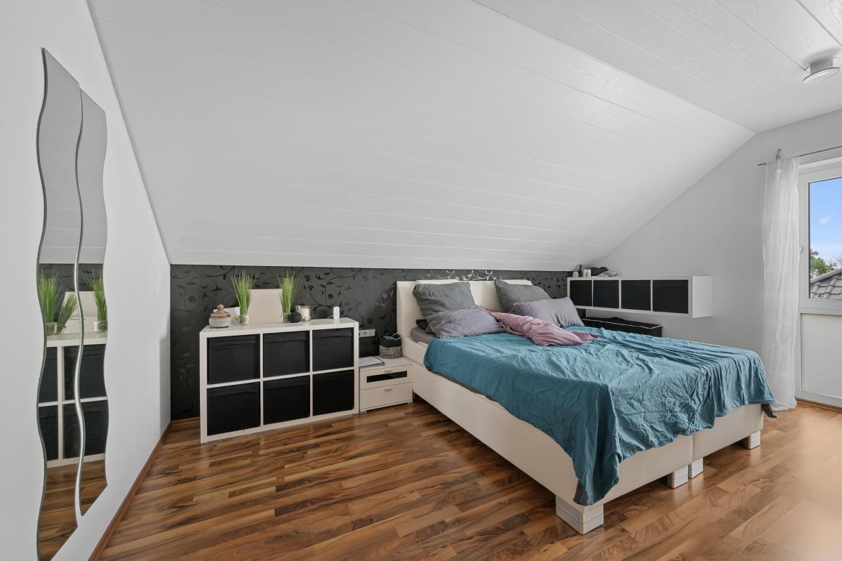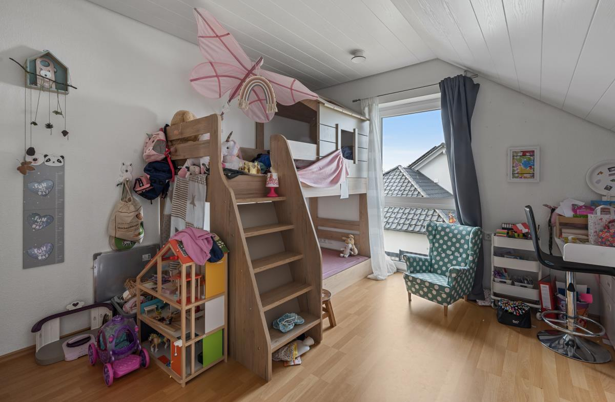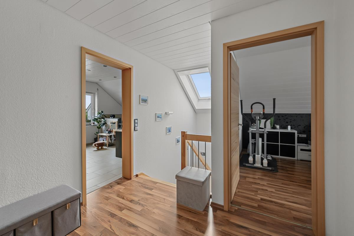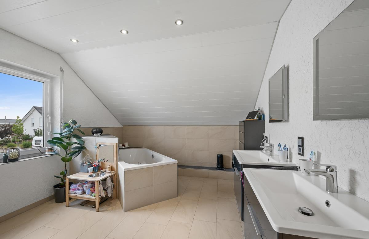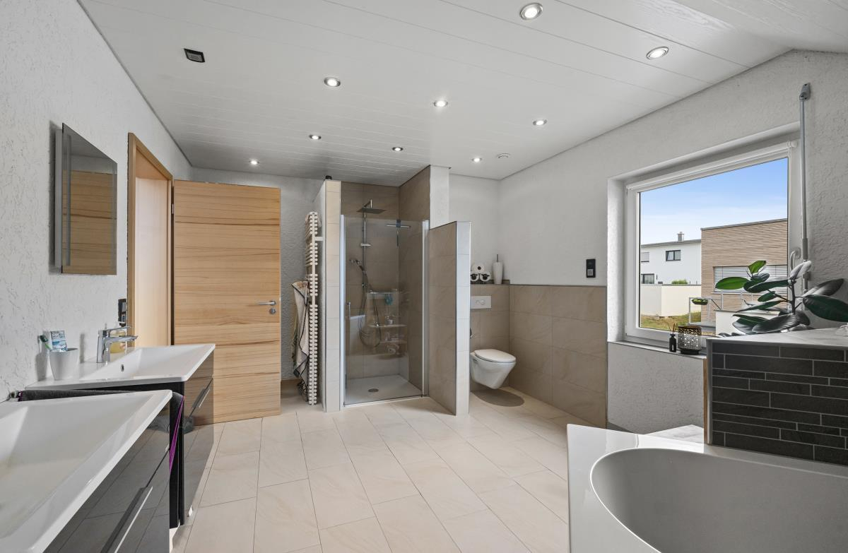 Im Obergeschoss des Hauses befindet sich drei geräumige Schlaf-/Kinderzimmer. Das Elternschlafzimmer verfügt zusätzlich über einen Ankleidebereich. Ein modernes Tageslichtbad mit großer, begehbarer Dusche, Badewanne, WC und Doppelwaschbecken lässt keine Wünsche offen.