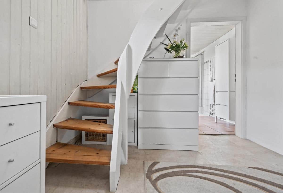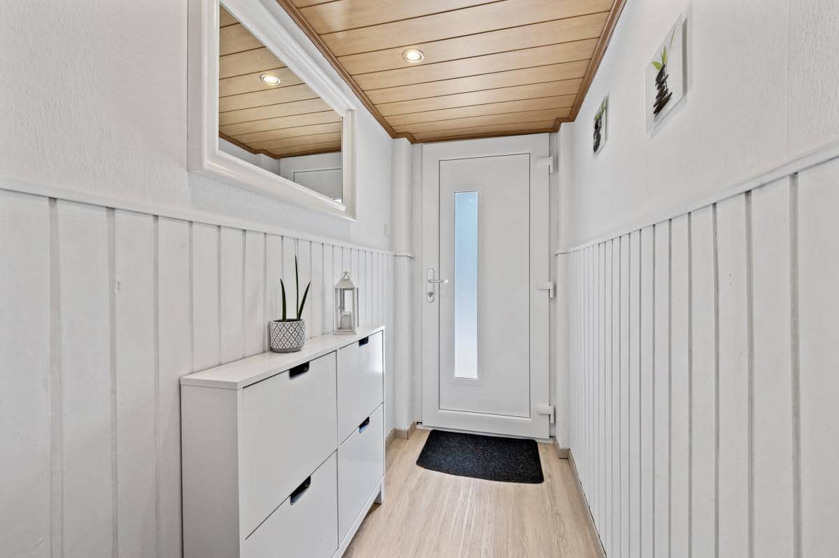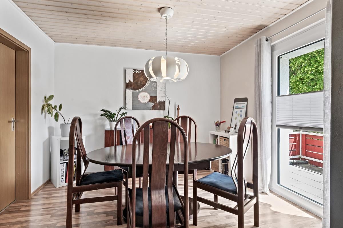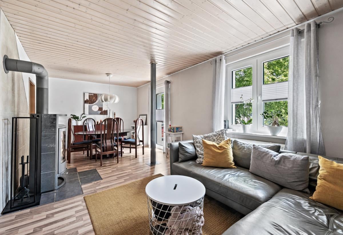 Das Obergeschoss überzeugt durch ein helles Wohn- und Esszimmer mit Zugang zu einem kleinen Balkon. Ein separater Küchenbereich mit moderner Einbauküche sowie ein Gäste-WC ergänzen diese Ebene. An kühlen Tagen sorgt ein Holzofen im Wohnbereich für eine behagliche Atmosphäre.