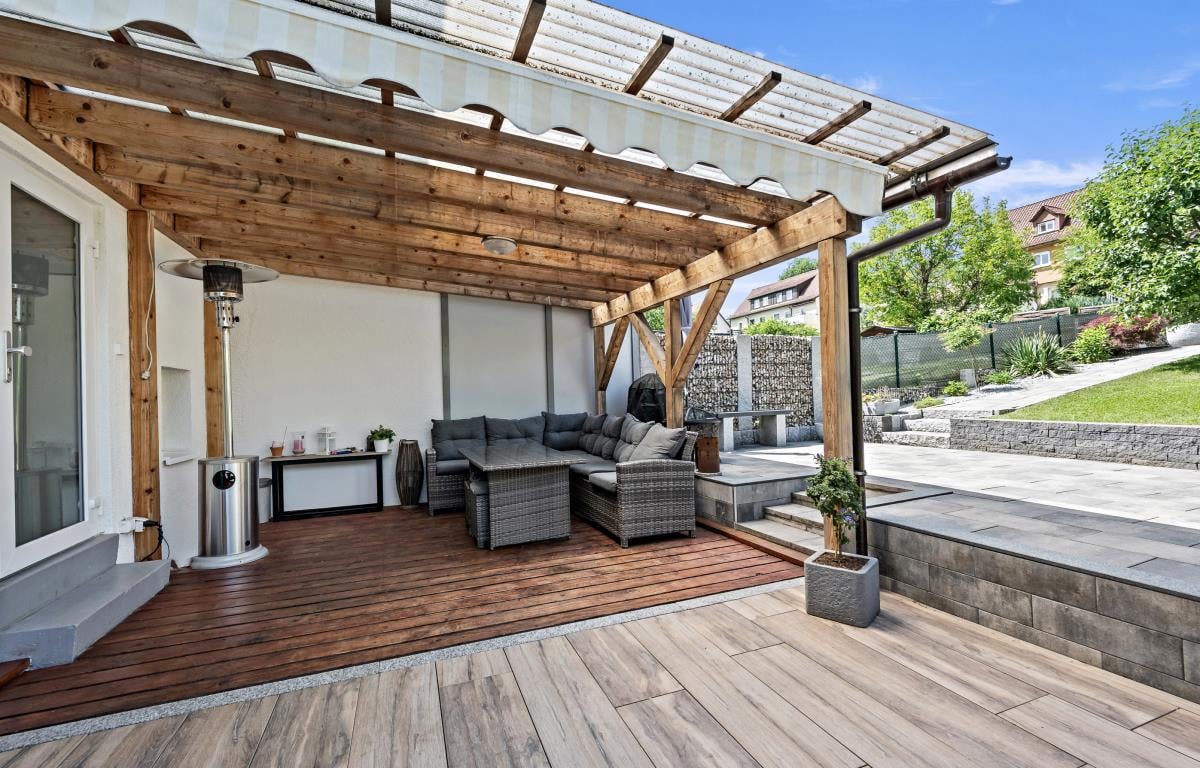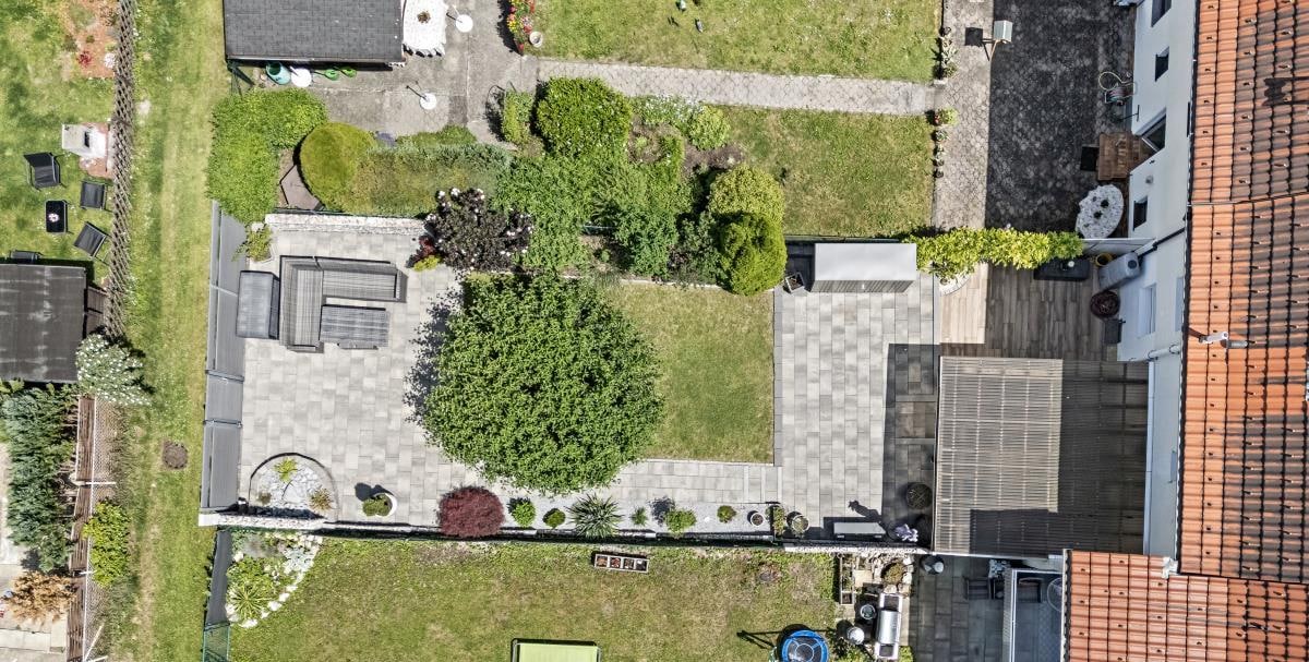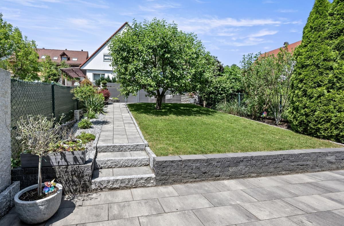 Der sonnige Gartenbereich auf der Rückseite des Hauses wurde im Jahr 2018 neu gestaltet und lädt mit zwei großen Terrassen zum Entspannen und Verweilen ein. Eine grüne Oase direkt am Haus – perfekt für Familienfeste oder ruhige Stunden im Freien.