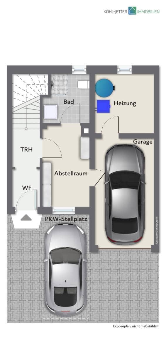 Im Erdgeschoss befinden sich die Garage mit direktem Zugang ins Haus, ein Heiz- und Technikraum, ein praktischer Abstellraum sowie ein Badezimmer mit Anschluss für eine Waschmaschine. Neben der Garage befindet sich ein PKW-Stellplatz für ein kleineres Auto. Zusätzlich befinden sich direkt an der Straße zahlreiche, öffentliche Stellplätze.