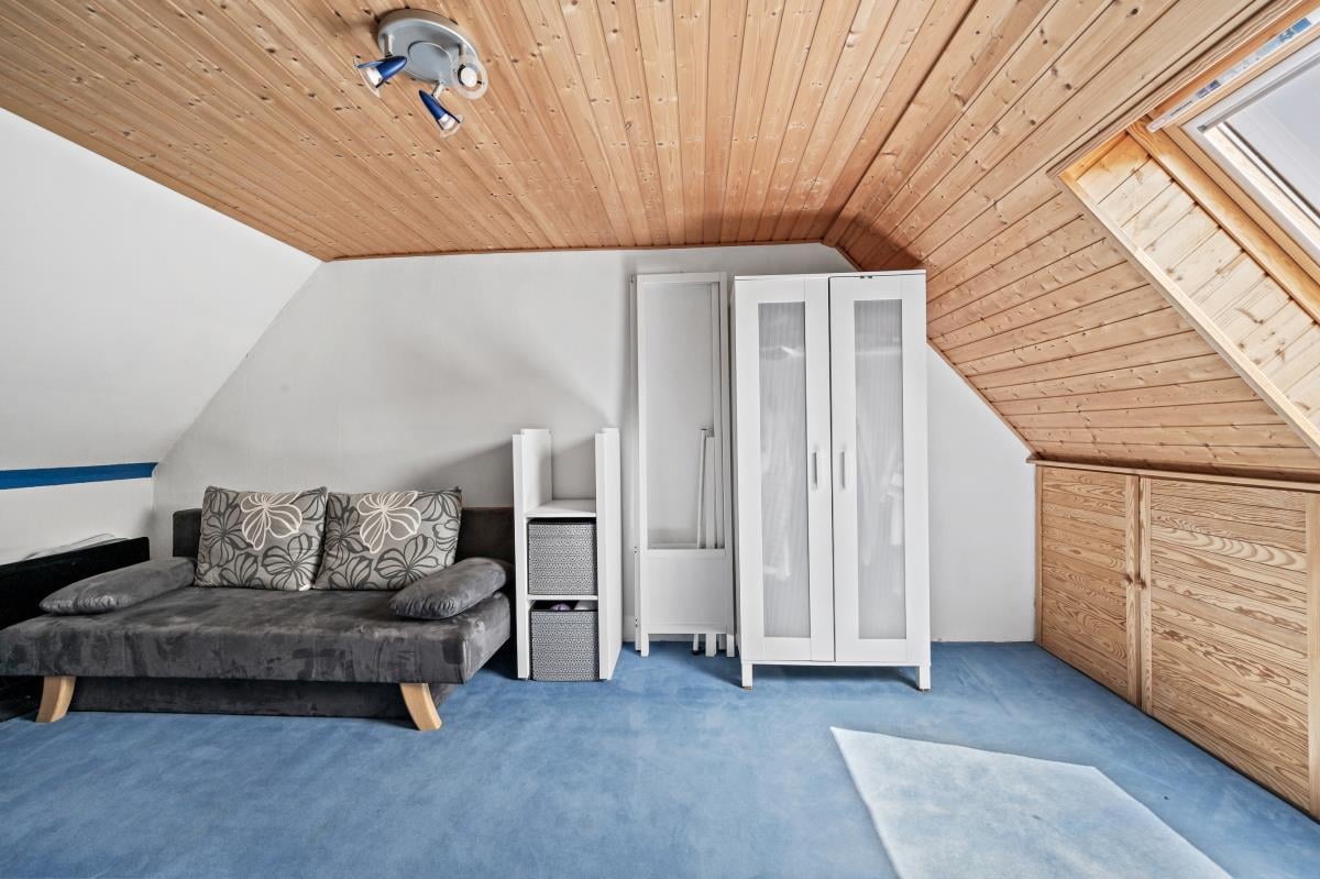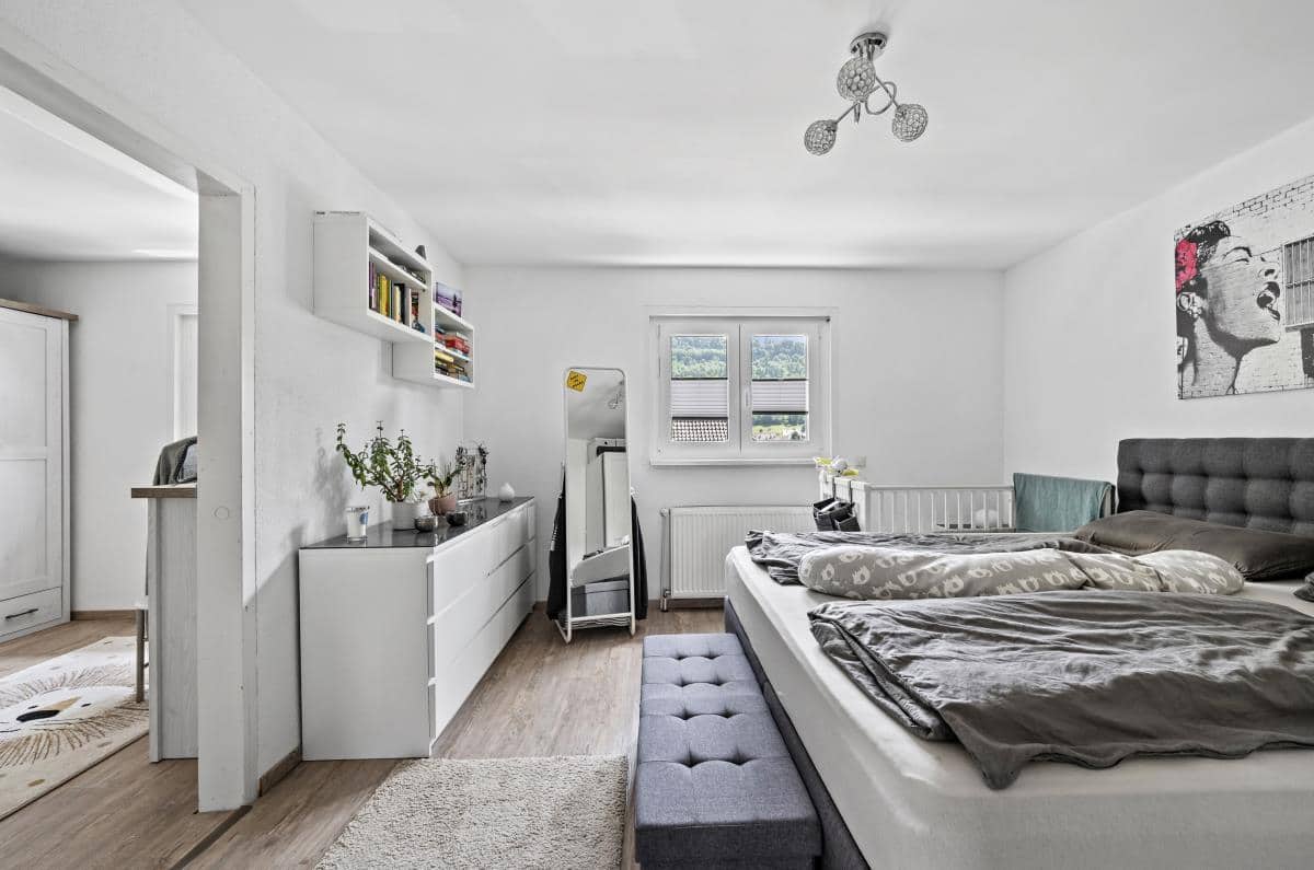 Im Dachgeschoss erwarten Sie ein großzügiges Schlafzimmer, ein angrenzendes Kinder- oder Ankleidezimmer sowie ein großes, Tageslichtbad mit Dusche, Badewanne und WC. Zusätzlich wurde der Bühnenbereich ausgebaut und bietet zwei weitere, flexibel nutzbare Räume – ideal als Büro, Gästezimmer oder für individuelle Hobbynutzung.