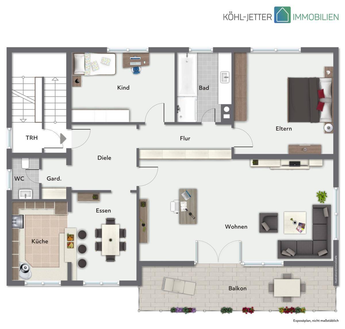 Sofern ein drittes Schlafzimmer benötigt wird, könnte das Esszimmer ggfls. vom Küchenbereich abgetrennt werden. Der Zugang zur Küche könnte somit über den Flurbereich erfolgen.