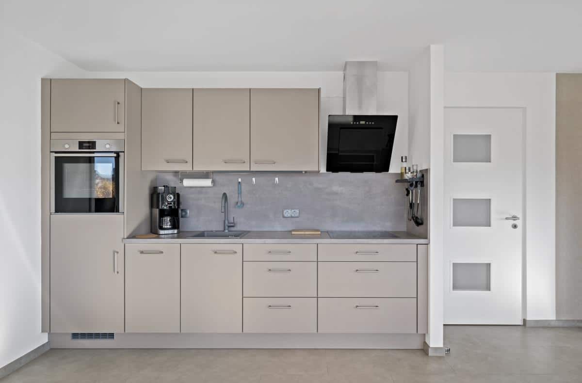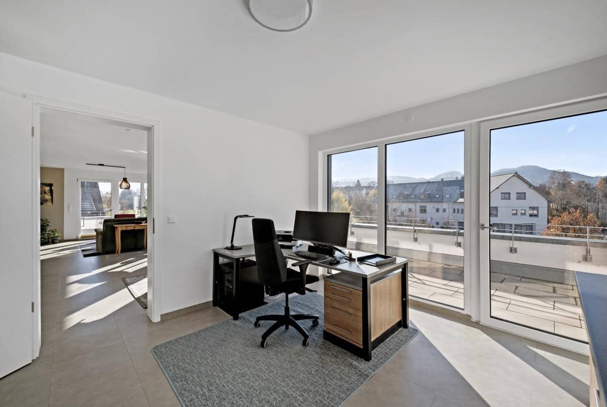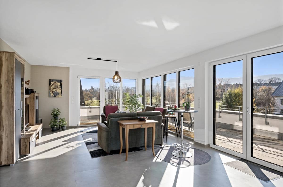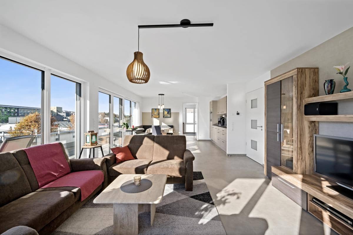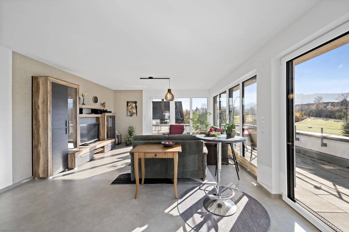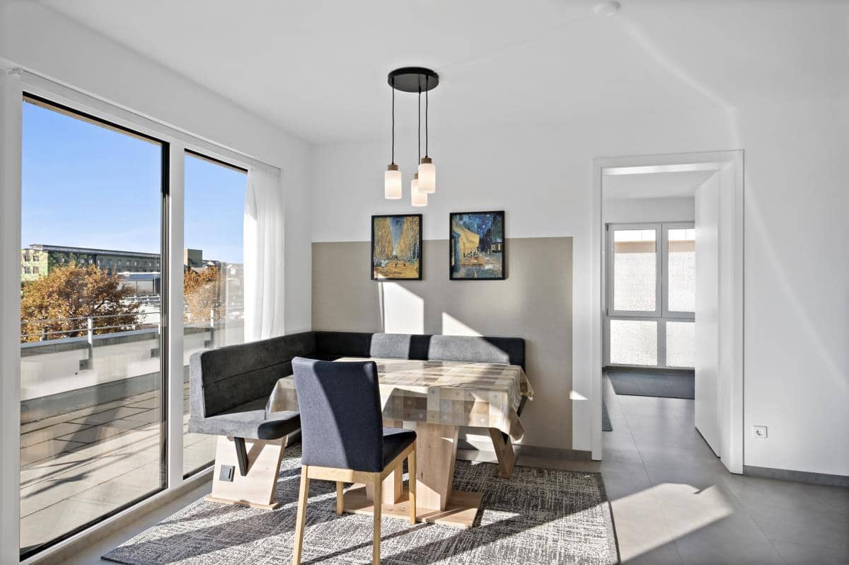 Der großzügige Wohn-/Ess- und Küchenbereich beeindruckt durch seine Helligkeit und den direkten Zugang auf die große Dachterrasse, die einen herrlichen Ausblick bietet und zu entspannten Sonnenstunden einlädt. Eine moderne Einbauküche, ebenfalls im Kaufpreis enthalten, fügt sich harmonisch in das offene Raumkonzept ein.