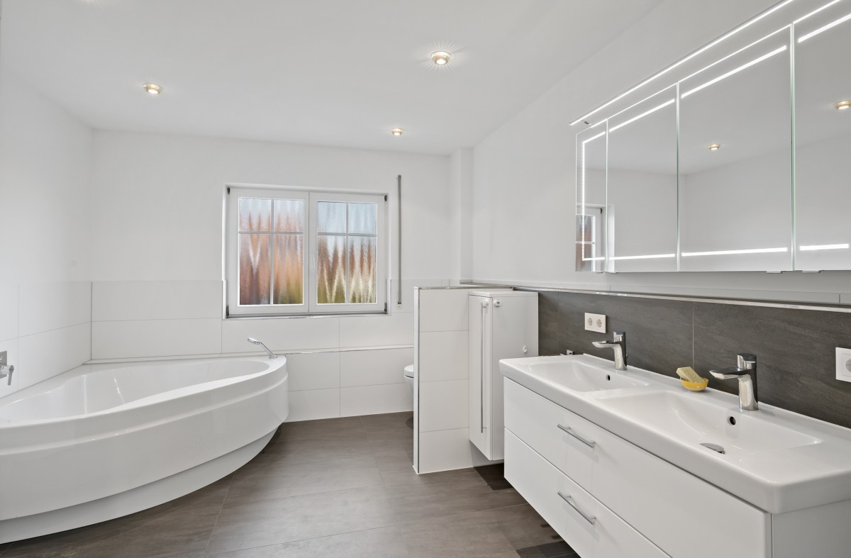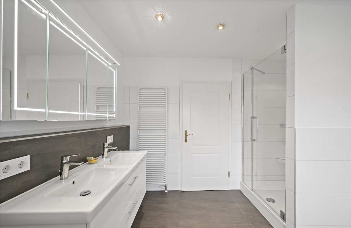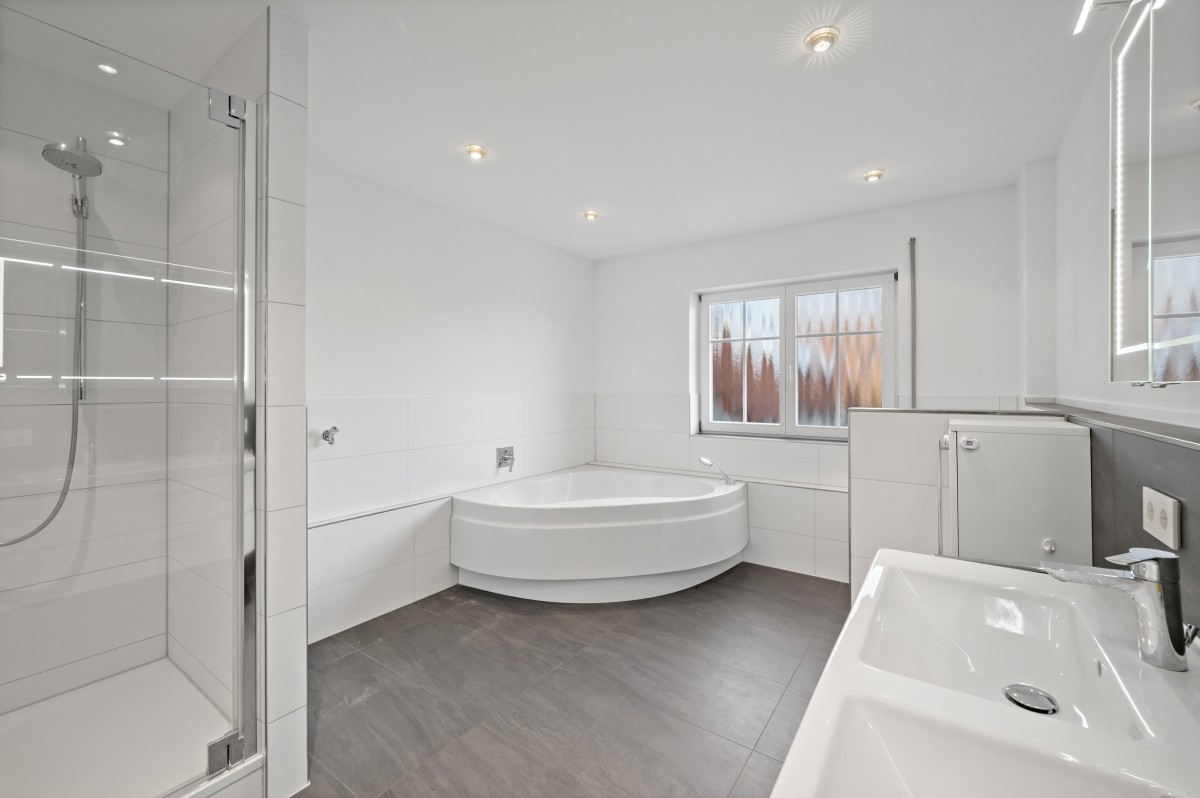 Das neuwertige Tageslichtbad mit Dusche, Badewanne und WC überzeugt durch eine moderne Ausstattung und hohen Komfort.