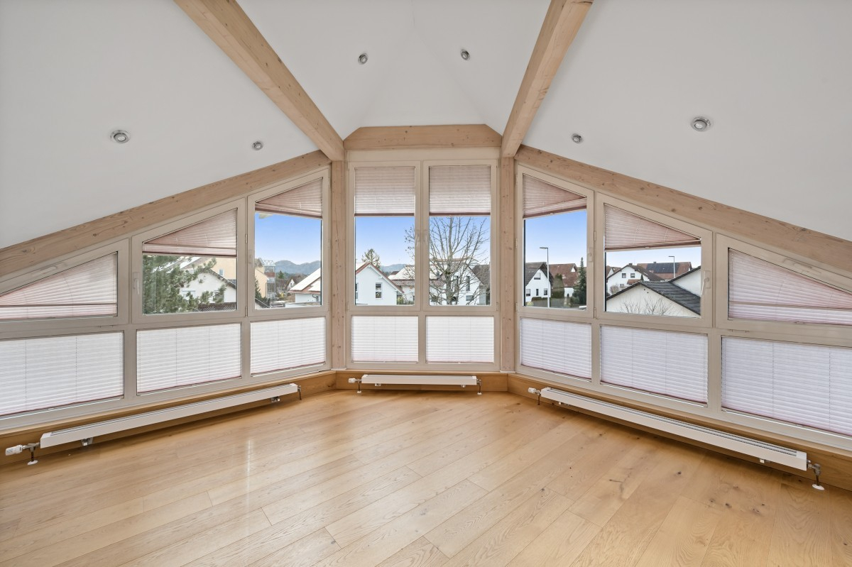 Zentrales Element ist der beeindruckend hohe Wohn- und Essbereich, der mit seiner offenen Raumhöhe und großen Fensterflächen ein einzigartiges Raumgefühl schafft. Eine elegante Treppe führt von hier aus in das darüberliegende Studiozimmer, das sich ideal als Arbeits-, Rückzugs- oder zusätzlicher Wohnbereich nutzen lässt.
