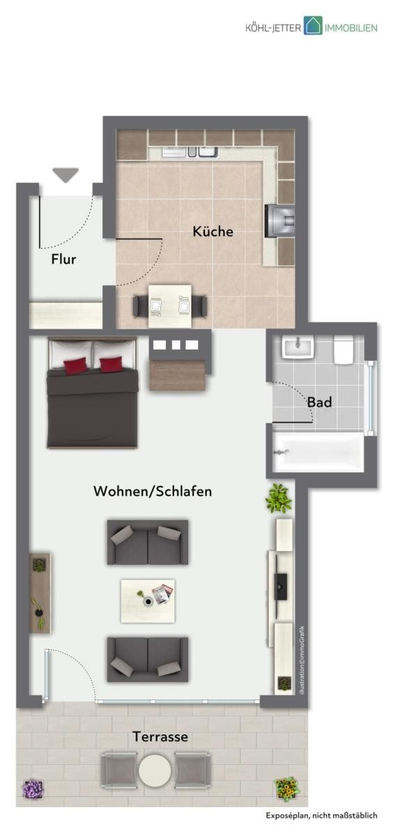 Herzstück ist der lichtdurchflutete Wohn,- Ess,- und Schlafbereich, der vielseitige Gestaltungsmöglichkeiten bietet.