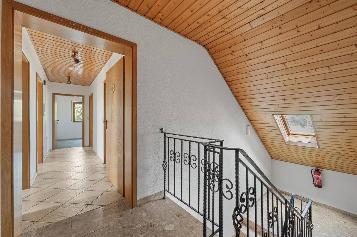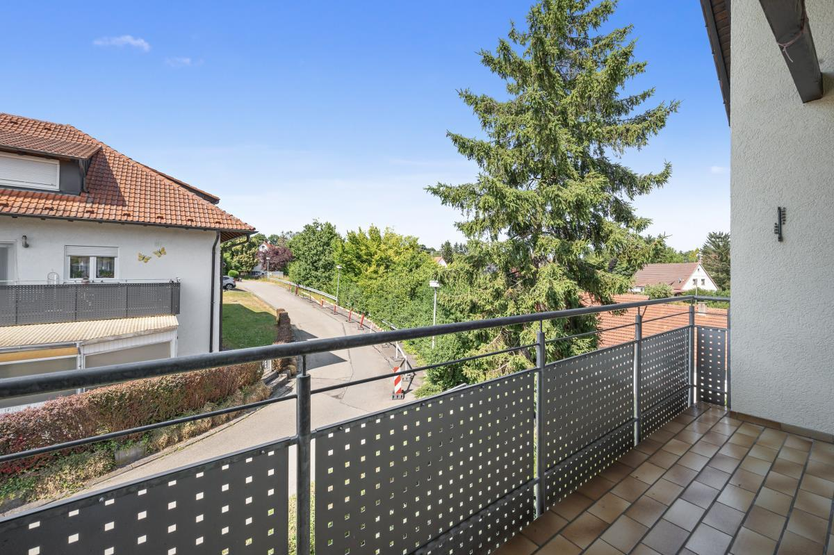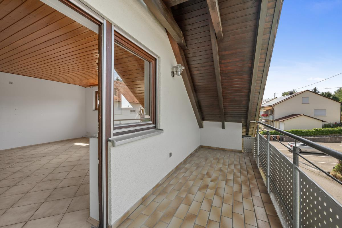 Besonders einladend ist der schöne Balkon, der dank des schützenden Dachvorsprungs auch bei weniger perfektem Wetter genutzt werden kann.