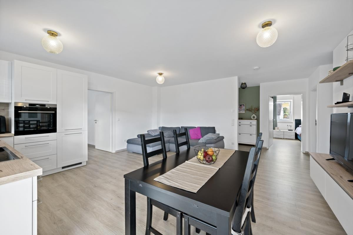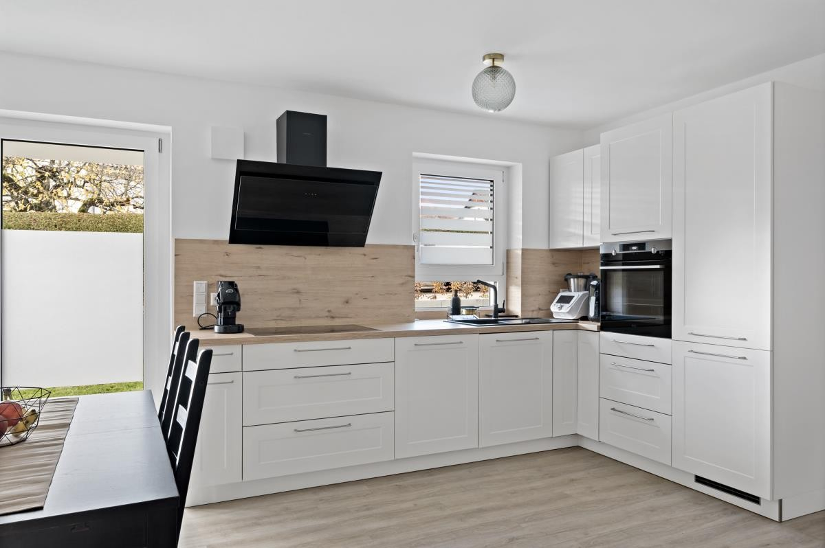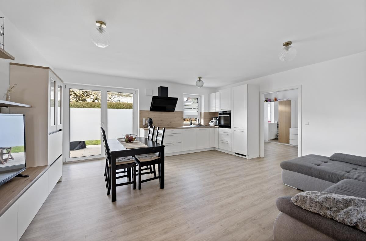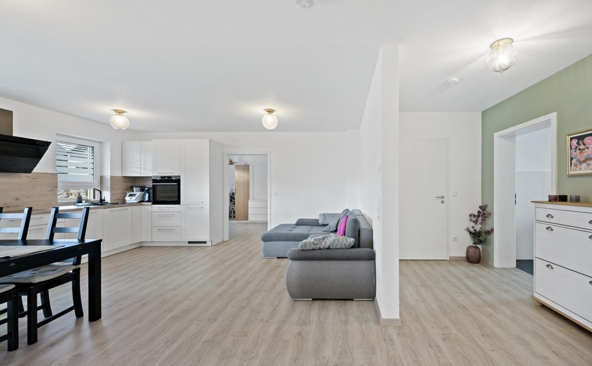 Der offene Wohn-, Ess- und Kochbereich bietet viel Platz zum Wohlfühlen. Eine hochwertige, neuwertige Einbauküche ist bereits im Kaufpreis enthalten und fügt sich harmonisch in das moderne Wohnkonzept ein. Große Fensterflächen sorgen für Transparenz und Helligkeit.
