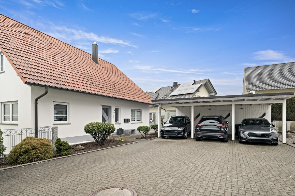 Zum Angebot gehören außerdem ein Außenstellplatz sowie ein Carport. Direkt angrenzend an den Carport befindet sich ein großzügiger Abstellbereich, der sich ideal für Fahrräder, Gartengeräte oder weiteres Lagergut eignet und praktischen Nutzen bietet.
