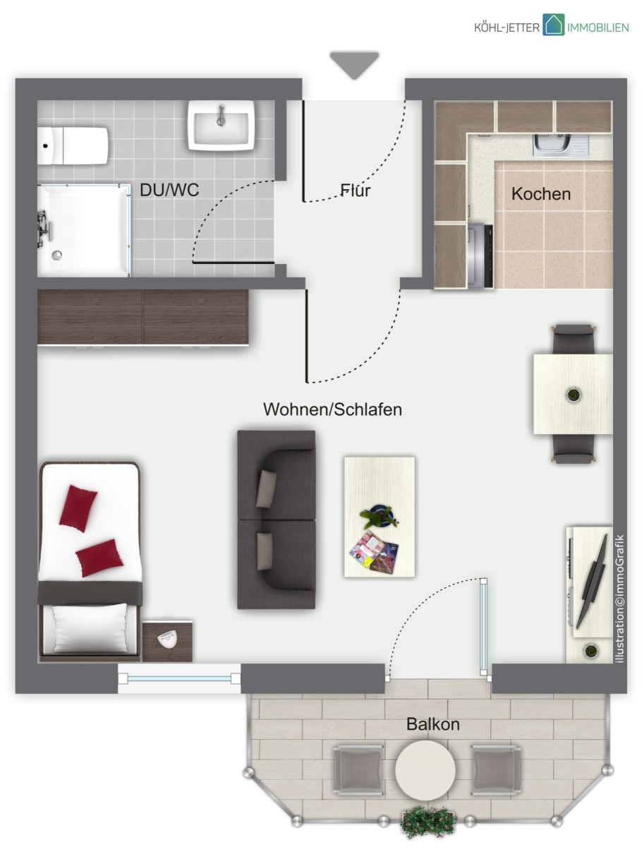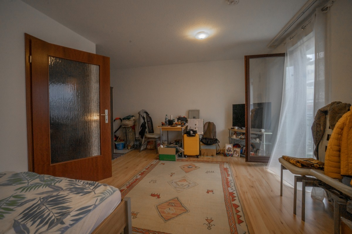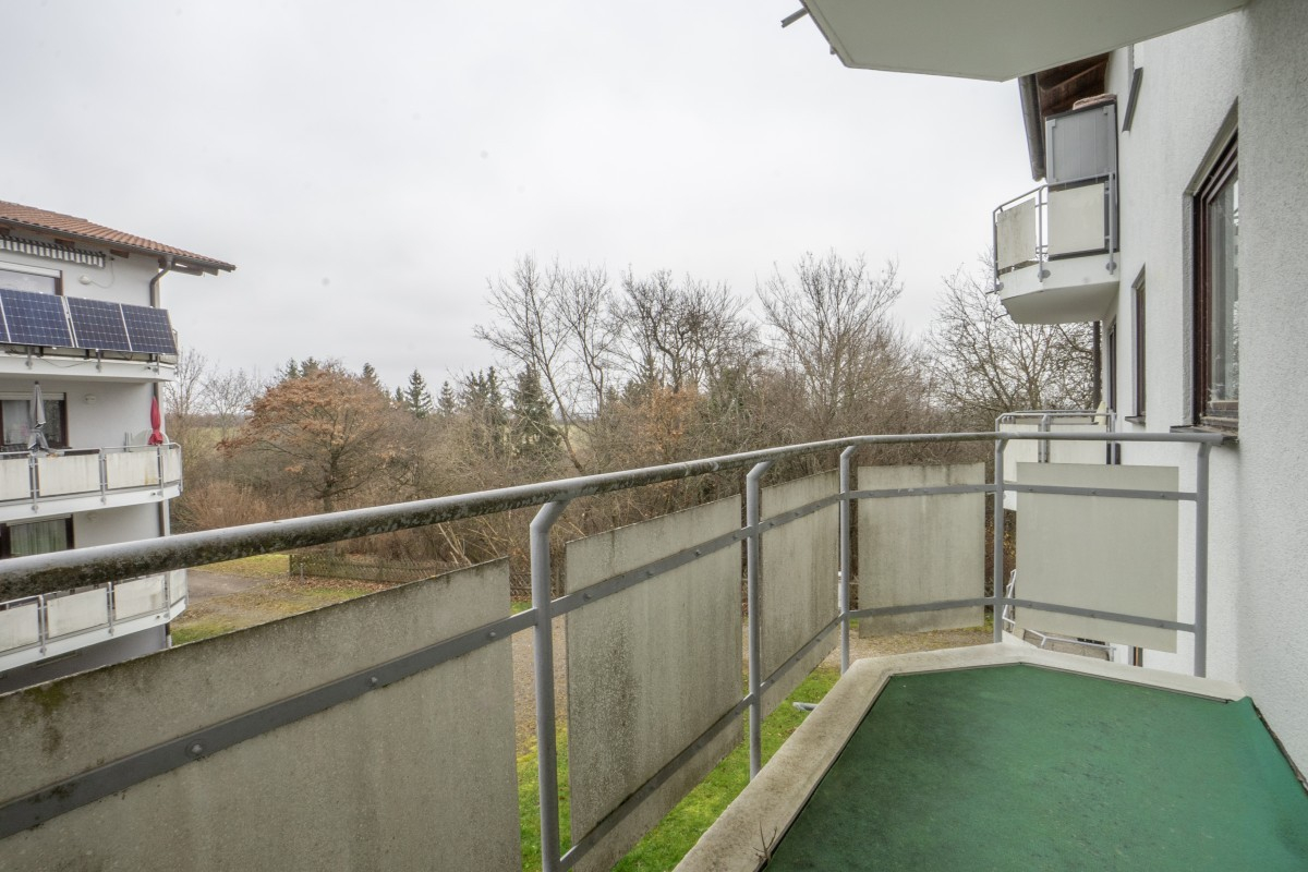 Über den Wohn-/Ess-/Schlafbereich gelangen Sie auf den südwestlich gerichteten Balkon mit Blick ins Grüne, der zum Verweilen einlädt.