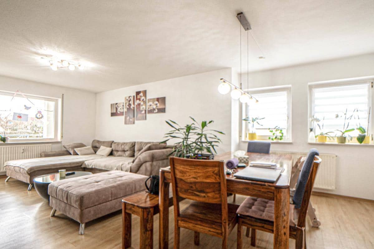Der helle und großzügig gestaltete Wohn- und Essbereich bietet vielfältige Einrichtungsmöglichkeiten und schafft eine einladende Atmosphäre.