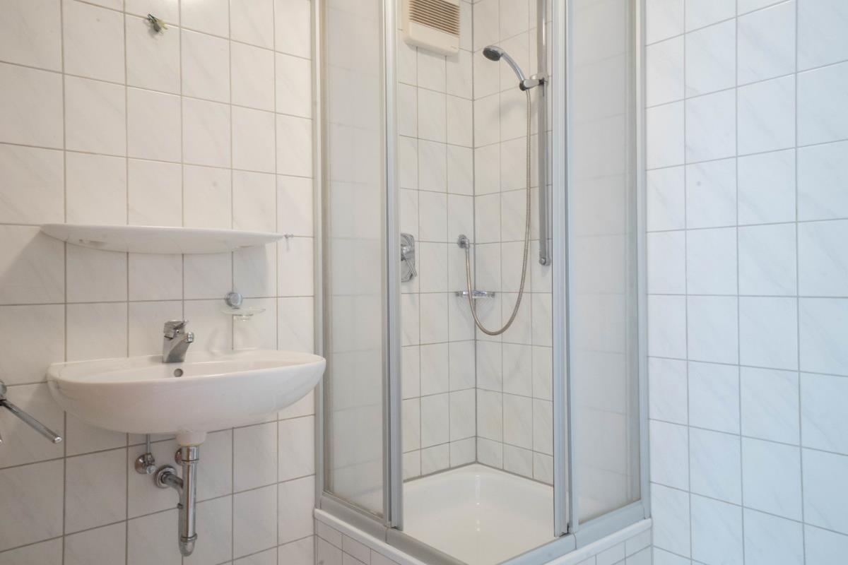 Das Badezimmer ist funktional ausgestattet und verfügt über eine Dusche, ein Waschbecken sowie ein WC.