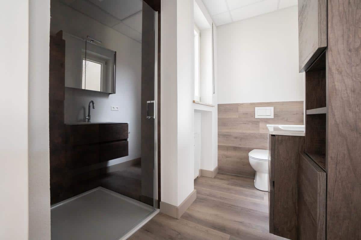 Für zusätzlichen Komfort sorgt ein kleiner Abstellraum innerhalb der Wohnung. Das moderne Badezimmer ist mit einer bodentiefen Dusche, einem Waschbecken und einer Toilette ausgestattet.