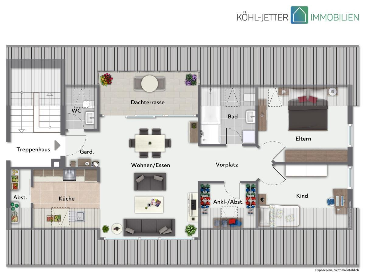 Das Herzstück der Wohnung bildet der großzügige Wohn- und Essbereich, der dank großer Fensterflächen von viel Tageslicht durchflutet wird. Von hier aus gelangen Sie auf die sonnige Dachterrasse, die zum Entspannen, Sonnen und Genießen einlädt.