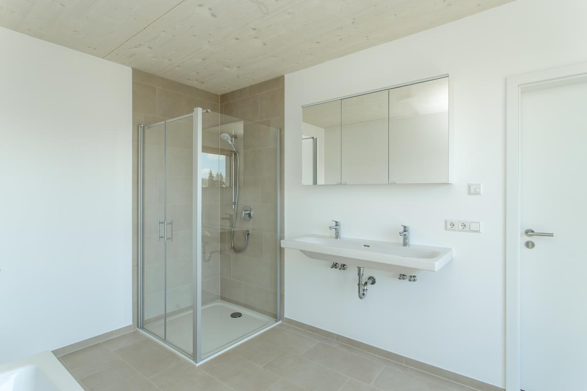 Offener Wohn-, Ess- und Küchenbereich mit moderner Raumgestaltung – Einbauküche inklusive hochwertiger Elektrogeräte – im Mietpreis enthalten – Modernes Badezimmer mit Doppelwaschbecken, Badewanne, Spiegelschrank und bodengleicher Dusche mit Glastüre