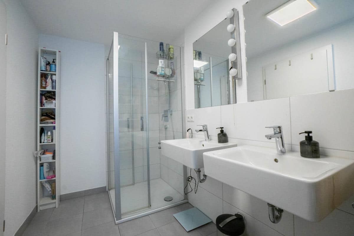 Das helle Tageslichtbad mit Dusche, WC und Doppelwaschbecken sorgt für Komfort im Alltag.