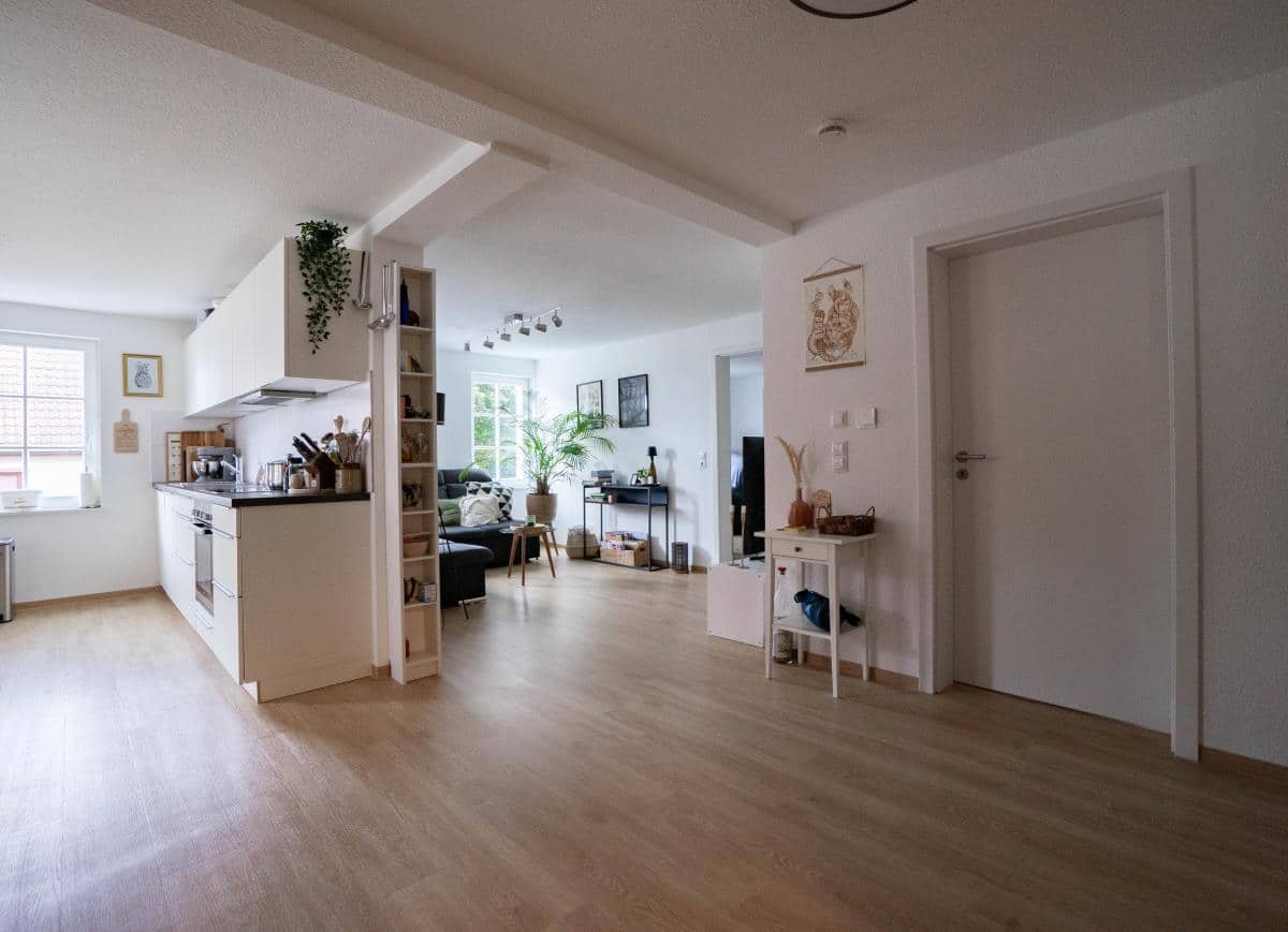 Der offene Ess- und Wohnbereich mit integrierter Küche bildet das Herzstück der Wohnung. Von hier aus gelangen Sie direkt auf den überdachten Balkon, der zum Entspannen einlädt.