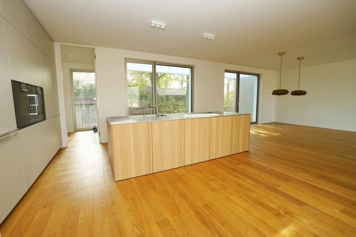Der offene Küchenbereich mit Kochinsel ist mit einer sehr hochwertigen Einbauküche ausgestattet, welche bereits im Mietpreis enthalten ist. Angrenzend an den Küchenbereich befindet sich der Wohn-/Essbereich mit idealer Größe und Aufteilung. Insgesamt verfügt der Wohn-/Ess-/Küchenbereich über eine Wohnfläche von knapp 90 m².