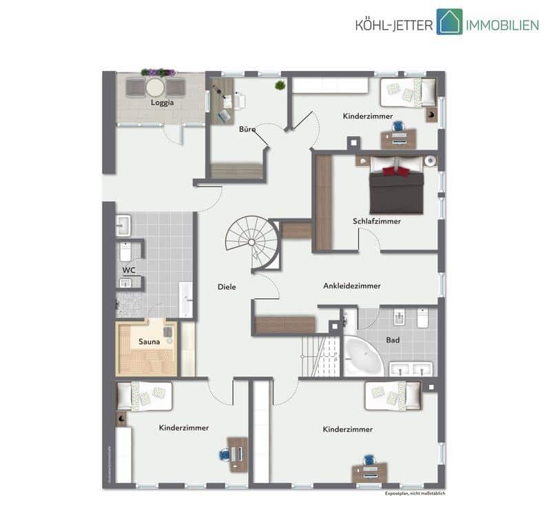 Im Obergeschoss erwartet Sie ein exklusiver Wellnessbereich mit Sauna und Ruhezone – Ihre private Oase zum Entspannen. Ergänzt wird dieses außergewöhnliche Wohnangebot durch eine großzügige Dachterrasse, die viel Platz zum Verweilen und Genießen bietet.